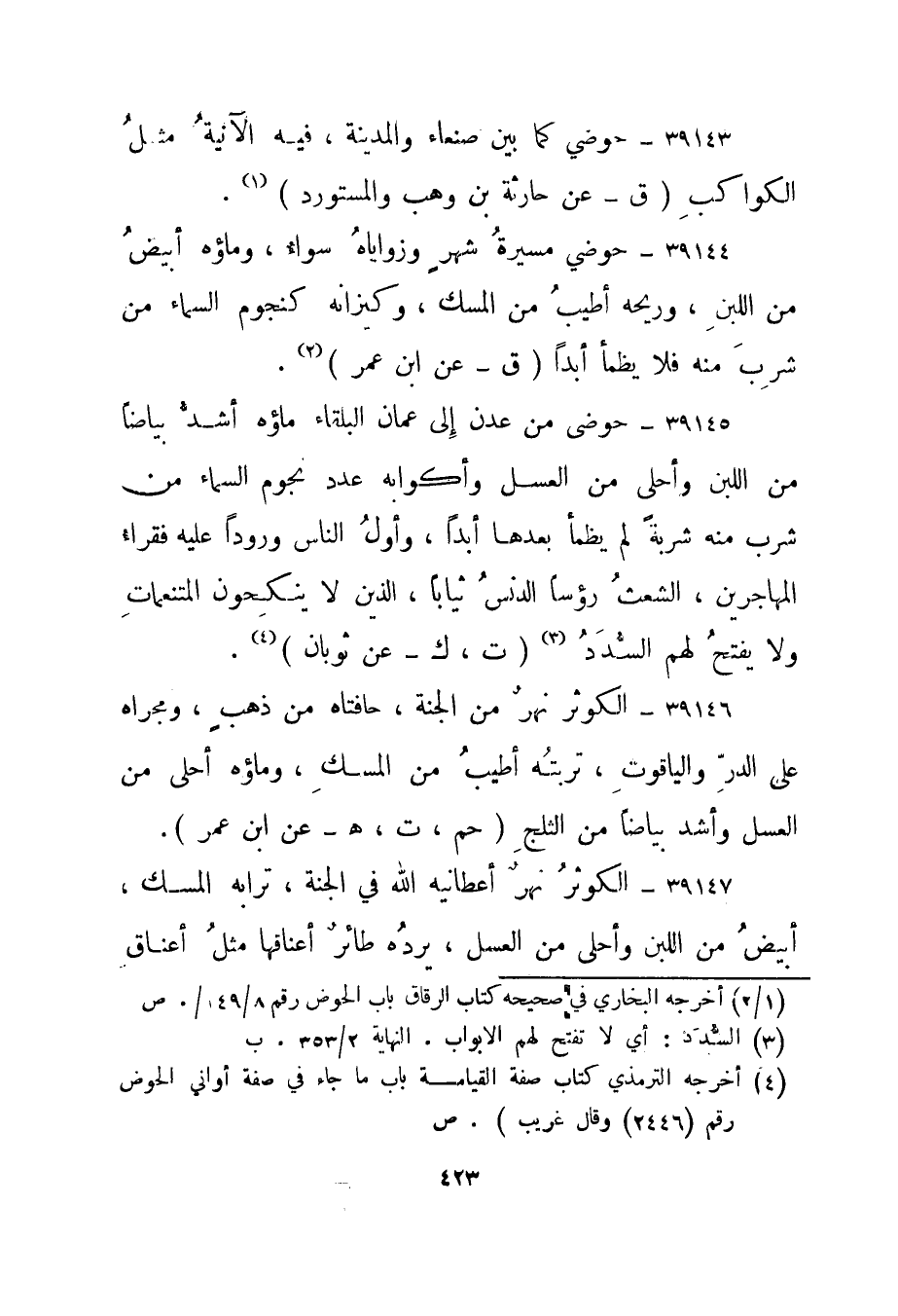 39143- "حوضي كما بين صنعاء والمدينة، فيه الآنية مثل الكواكب." ق - عن حارثة بن وهب والمستورد" 1