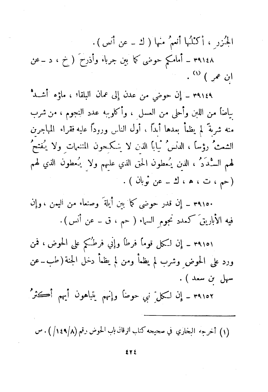 39150- "إن قدر حوضى كما بين أيلة صنعاء من اليمن، وإن فيه الأباريق كعدد نجوم السماء." حم، ق - عن أنس".