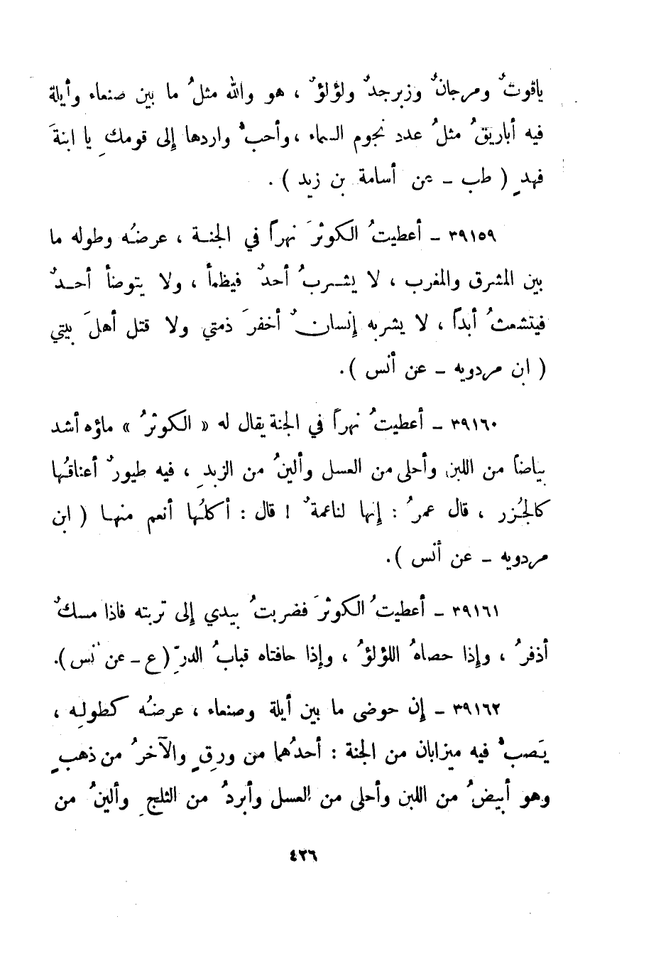 39159- "أعطيت الكوثر نهرا في الجنة، عرضه وطوله ما بين المشرق والمغرب، لا يشرب أحدا فيظمأ، ولا يتوضأ أحد فيتشعث أبدا، لا يشربه إنسان أخفر ذمتي ولا قتل أهل بيتي." ابن مردويه - عن أنس".