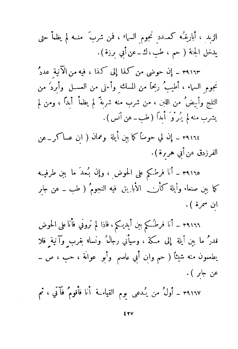 39164- "إن لي حوضا كما بين أيلة وعمان." ابن عساكر - عن الفرزدق عن أبي هريرة".