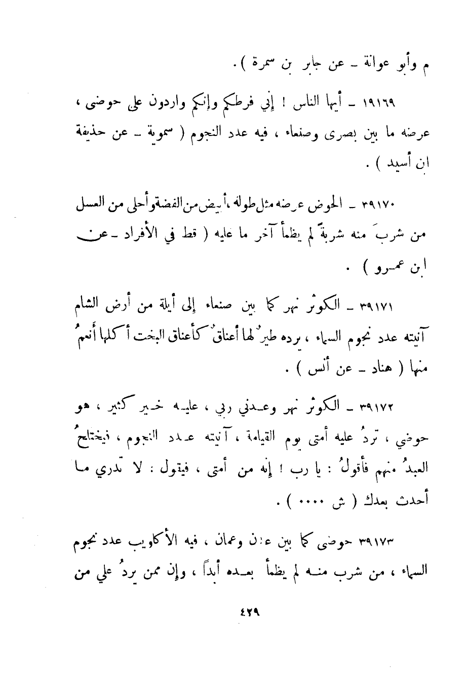 39173- "حوضى كما بين عدن وعمان، فيه الأكاويب عدد نجوم السماء، من شرب منه لم يظمأ بعده أبدا، وإن ممن يرد علي من