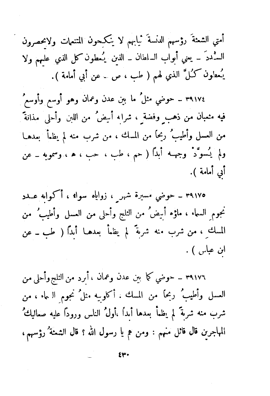 39175- "حوضي مسيرة شهر، زواياه سواء، أكوابه عدد نجوم السماء، ماؤه أبيض من الثلج وأحلى من العسل وأطيب من المسك، من شرب منه شربة لم يظمأ بعدها أبدا." طب - عن ابن عباس".
