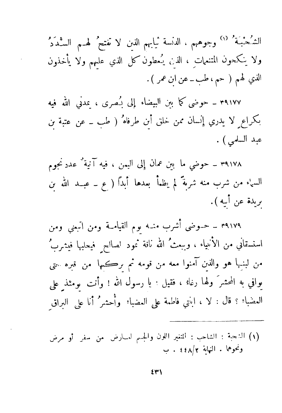 39178- "حوضي ما بين عمان إلى اليمن، فيه آنية عدد نجوم السماء من شرب منه شربة لم يظمأ بعدها أبدا." ع - عبد الله بن بريدة عن أبيه".