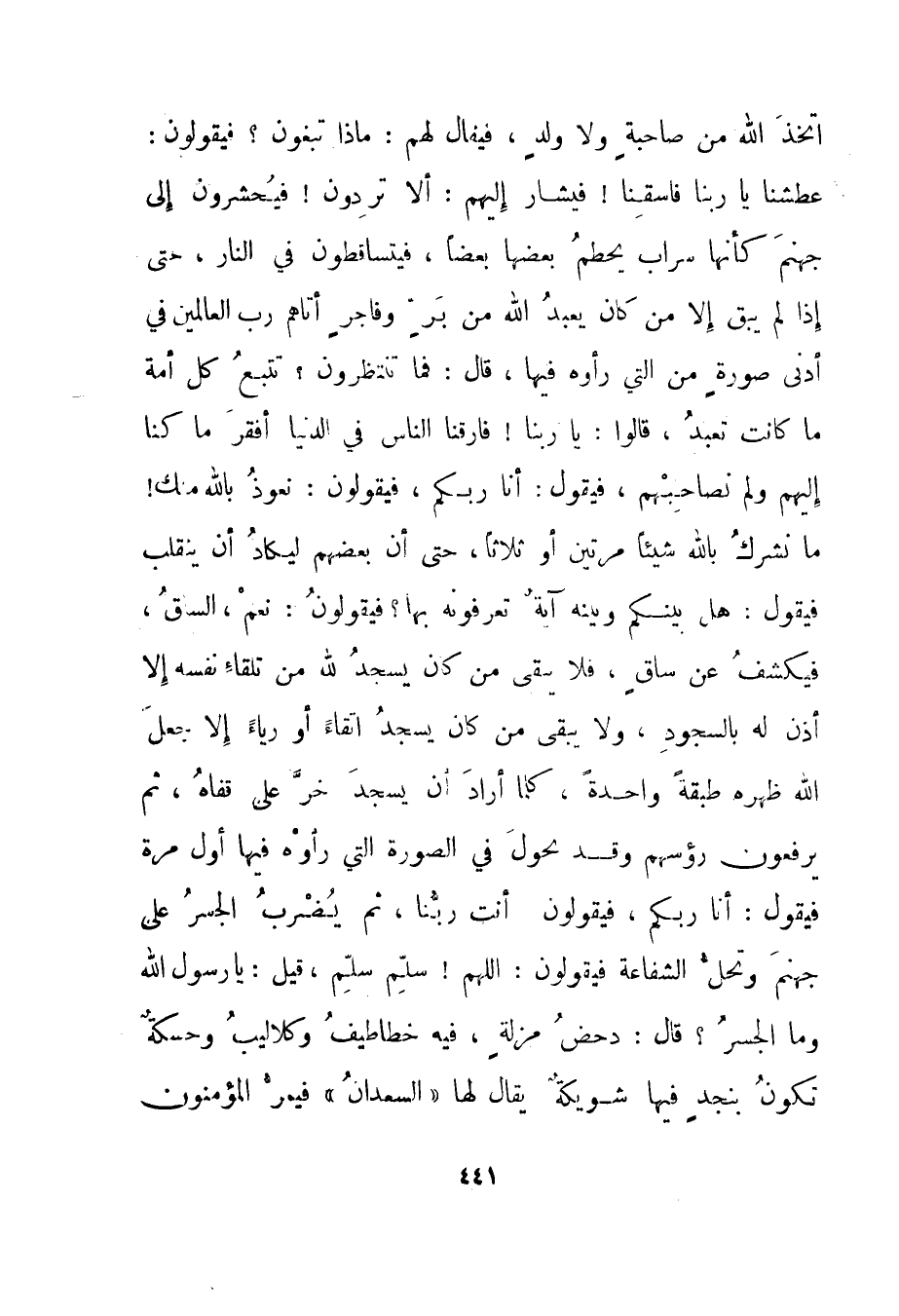اتخذ الله من صاحبة ولا ولد، فيقال لهم: ماذا تبغون؟ فيقولون: عطشنا يا ربنا فاسقنا! فيشار إليهم: ألا تردون! فيحشرون إلى جهنم كأنها سراب يحطم بعضها بعضا، فيتساقطون في النار، حتى إذا لم يبق إلا من كان يعبد الله من بر وفاجر أتاهم رب العالمين في أدنى صورة من التي رأوه فيها، قال: فما تنتظرون؟ تتبع كل أمة ما كانت تعبد، قالوا: يا ربنا! فارقنا الناس في الدنيا أفقر ما كنا إليهم ولم نصاحبهم، فيقول: أنا ربكم، فيقولون: نعوذ بالله منك! ما نشرك بالله شيئا مرتين أو ثلاثا، حتى أن بعضهم ليكاد أن ينقلب فيقول: هل بينكم وبينه آية تعرفونه بها؟ فيقولون: نعم، الساق، فيكشف عن ساق، فلا يبقى من كان يسجد لله من تلقاء نفسه إلا أذن له بالسجود، ولا يبقى من كان يسجد اتقاء أو رياء إلا جعل الله ظهره طبقة واحدة، كلما أراد أن يسجد خر على قفاه، ثم يرفعون رؤسهم وقد يحول في الصورة التي رأوه فيها أول مرة فيقول: أنا ربكم، فيقولون أنت ربنا ثم يضرب الجسر على جهنم وتحل الشفاعة فيقولون: اللهم! سلم سلم، قيل: يا رسول الله وما الجسر؟ قال: دحض مزلة، فيه خطاطيف وكلاليب وحسكة تكون بنجد فيها شويكة يقال لها "السعدان" فيمر المؤمنون