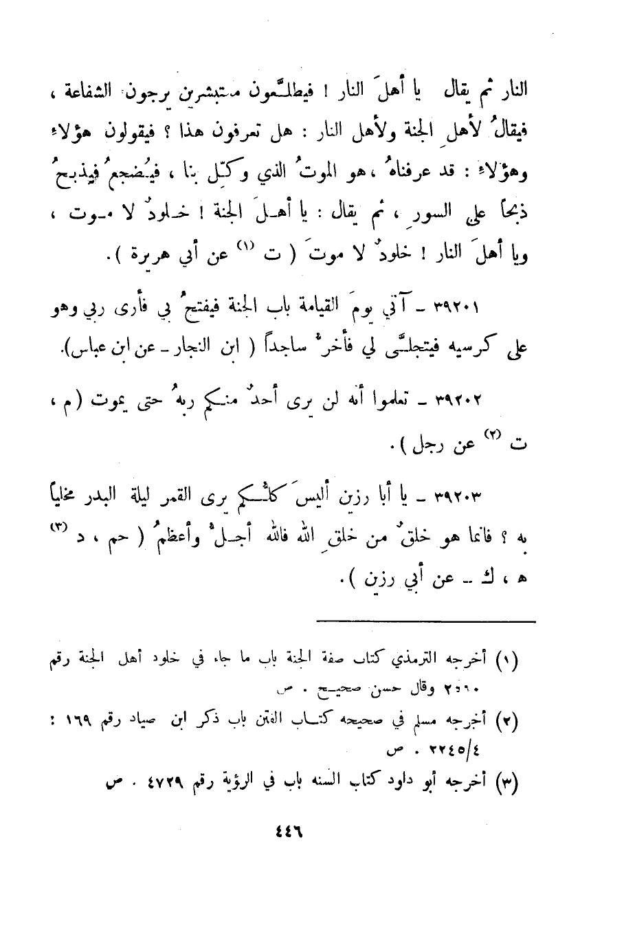 1 أخرجه الترمذي كتاب صفة الجنة باب ما جاء في خلود أهل الجنة رقم 2590 وقال حسن صحيح. ص
