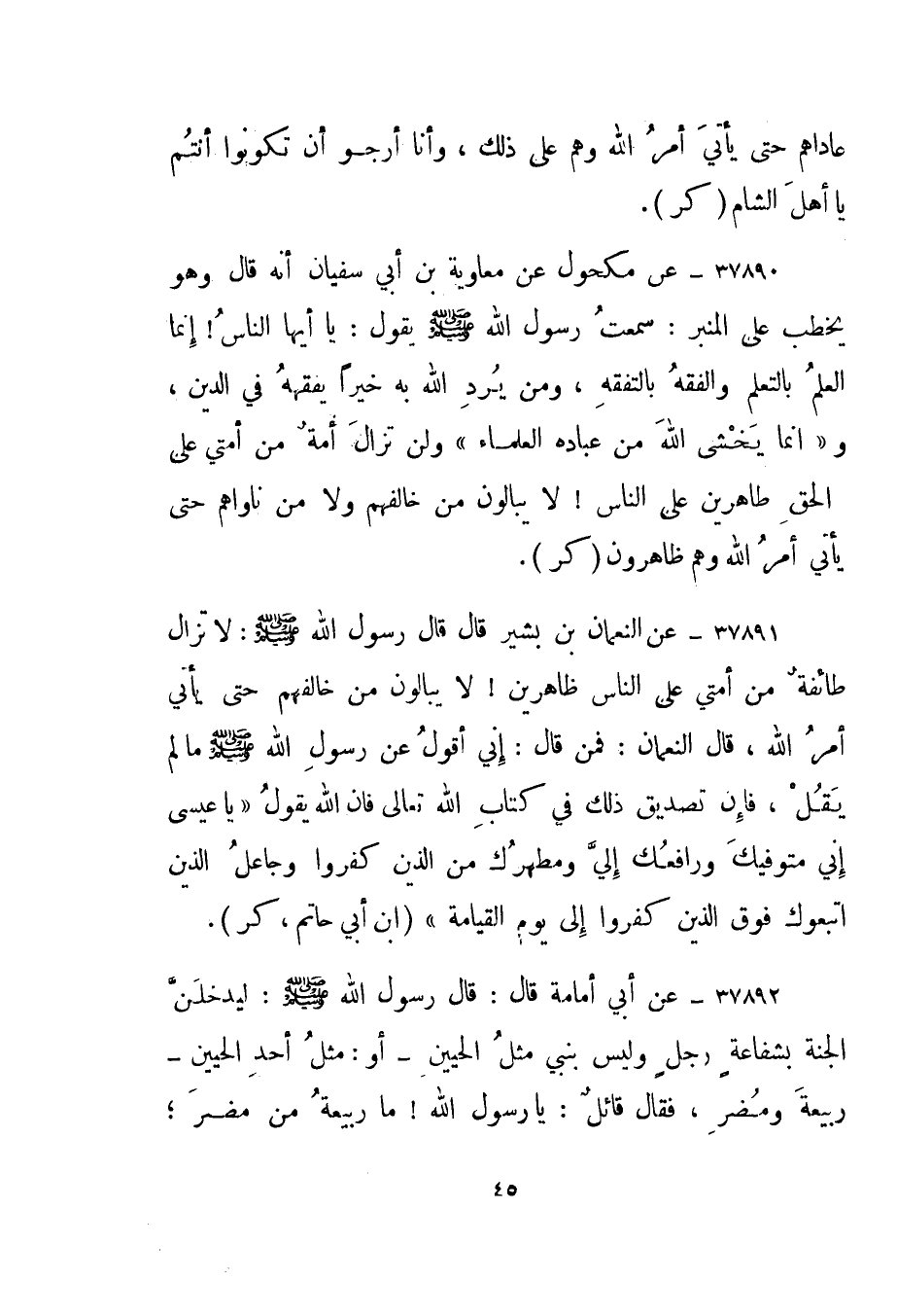 عاداهم حتى يأتي أمر الله وهم على ذلك، وأنا أرجو أن تكونوا أنتم يا أهل الشام". "كر".