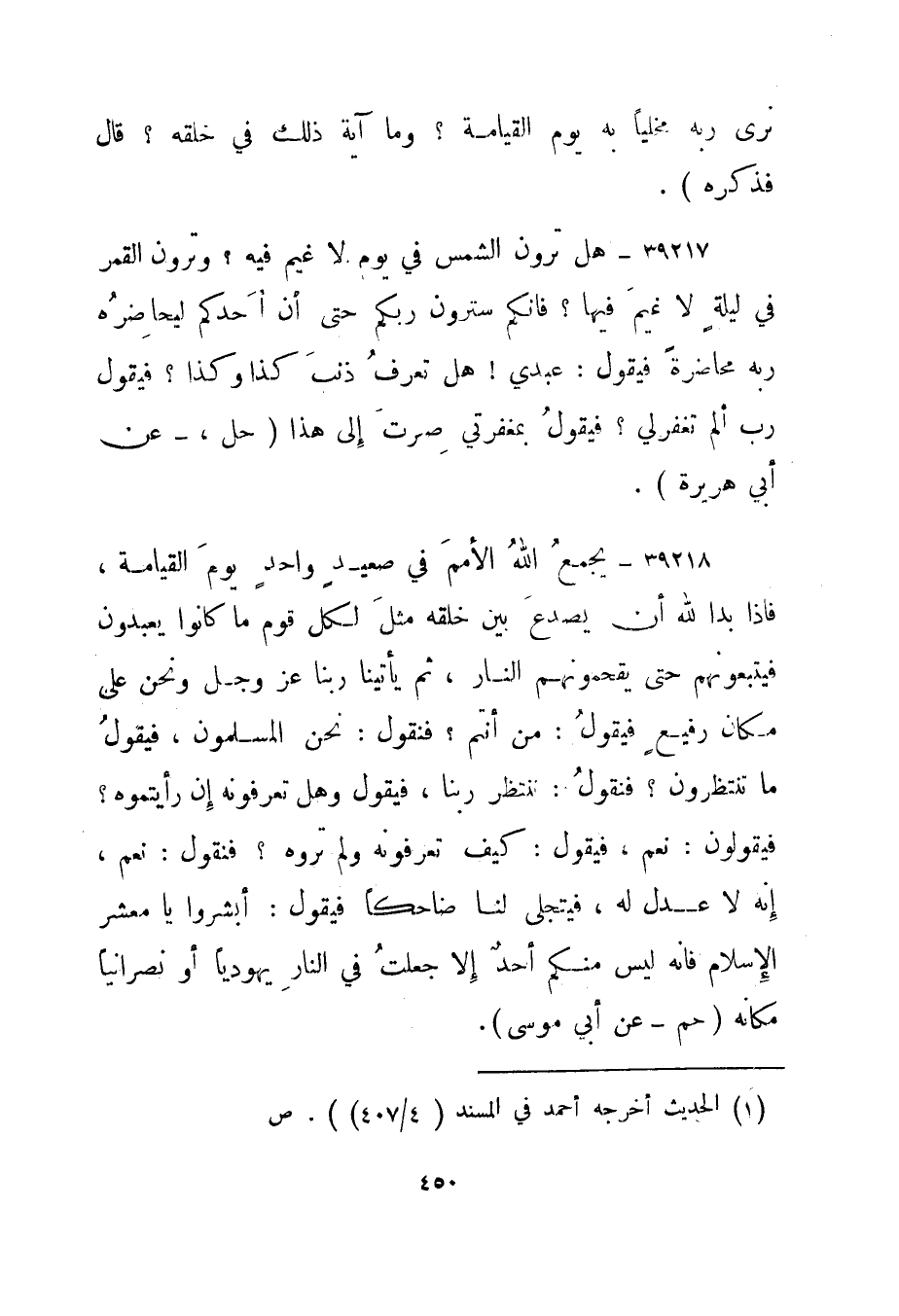 39217- "هل ترون الشمس في يوم لا غيم فيه؟ وترون القمر في ليلة لا غيم فيها؟ فإنكم سترون ربكم حتى أن أحدكم ليحاضره ربه محاضرة فيقول: عبدي! هل تعرف ذنب كذا وكذا؟ فيقول رب ألم تغفر لي؟ فيقول بمغفرتي صرت إلى هذا." حل، - عن أبي هريرة".