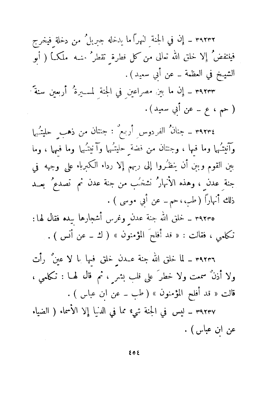 39234- "جنان الفردوس أربع: جنتان من ذهب حليتهما وآنيتهما وما فيها، وجنتان من فضة حليتهما وآنيتهما وما فيهما، وما بين القوم وبين أن ينظروا إلى ربهم إلا رداء الكبرياء على وجهه في جنة عدن، وهذه الأنهار تشخب من جنة عدن ثم تصدع بعد ذلك أنهارا." طب، حم - عن أبي موسى".