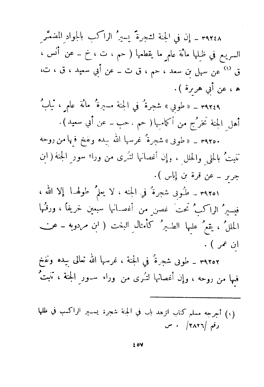 39249- "طوبى" شجرة في الجنة مسيرة مائة عام، ثياب أهل الجنة تخرج من أكمامها." حم، حب - عن أبي سعيد".