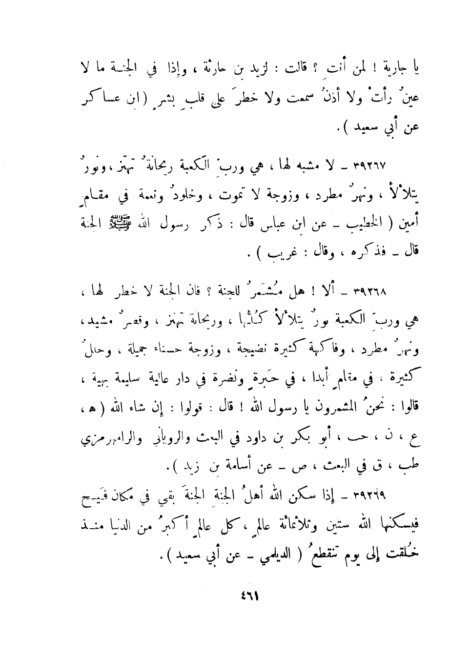 39269- "إذا سكن الله أهل الجنة الجنة بقي في مكان فسيح فيسكنها الله ستين وثلاثمائة عالم، كل عالم أكبر من الدنيا منذ خلقت إلى يوم تنقطع." الديلمي - عن أبي سعيد".