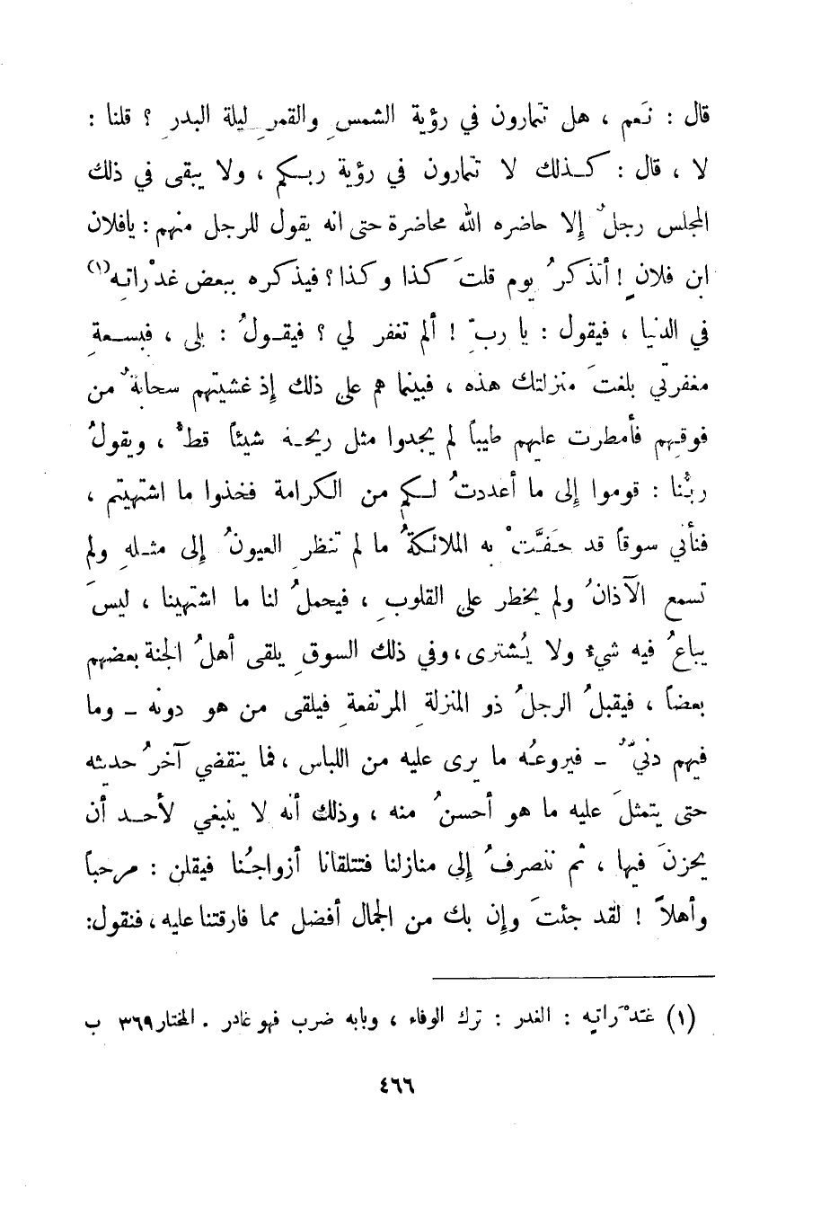قال: نعم، هل تتمارون في رؤية الشمس والقمر ليلة البدر؟ قلنا: لا، قال: كذلك لا تتمارون في رؤية ربكم، ولا يبقى في ذلك المجلس رجل إلا حاضره الله محاضرة حتى أنه يقول للرجل منهم: يا فلان ابن فلان! أتذكر يوم قلت كذا وكذا؟ فيذكره ببعض غدراته1 في الدنيا، فيقول: يا رب! ألم تغفر لي؟ فيقول: بلى، فبسعة مغفرتي بلغت منزلتك هذه، فبينما هم على ذلك إذ غشيتهم سحابة من فوقهم فأمطرت عليهم طيبا لم يجدوا مثل ريحه شيئا قط، ويقول ربنا: قوموا إلى ما أعددت لكم من الكرامة فخذوا ما اشتهيتم، فنأتي سوقا قد حفت به الملائكة ما لم تنظر العيون إلى مثله ولم تسمع الآذان ولم يخطر على القلوب، فيحمل لنا ما اشتهينا، ليس يباع فيه شيء ولا يشترى، وفي ذلك السوق يلقى أهل الجنة بعضهم بعضا، فيقبل الرجل ذو المنزلة المرتفعة فيلقى من هو دونه - وما فيهم دني - فيروعه ما يرى عليه من اللباس، فما ينقضي آخر حديثه حتى يتمثل عليه ما هو أحسن منه، وذلك أنه لا ينبغي لأحد أن يحزن فيها، ثم ننصرف إلى منازلنا فتتلقانا أزواجنا فيقلن: مرحبا وأهلا! لقد جئت وإن بك من الجمال أفضل مما فارقتنا عليه، فنقول:
