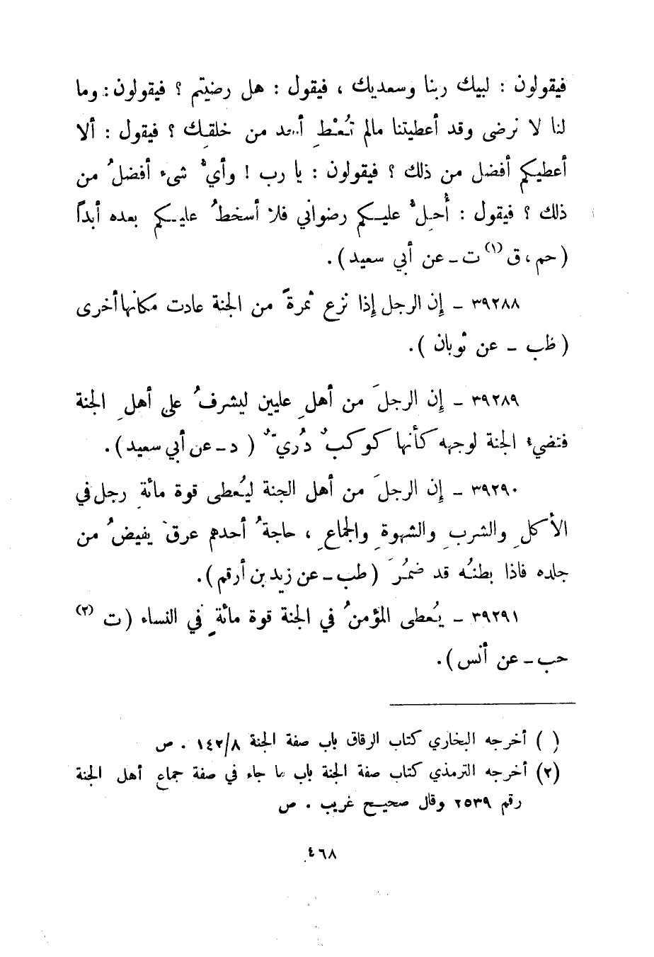2 أخرجه الترمذي كتاب صفة الجنة باب ما جاء في صفة جماع أهل الجنة رقم 2539 وقال صحيح غريب. ص