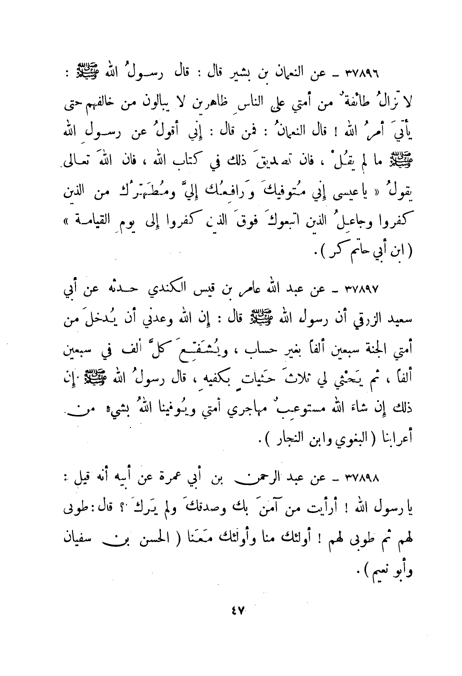 37896- عن النعمان بن بشير قال: قال رسول الله صلى الله عليه وسلم: "لا تزال طائفة من أمتي على الناس ظاهرين لا يبالون من خالفهم حتى يأتي أمر الله! " قال النعمان: فمن قال: إني أقول عن رسول الله صلى الله عليه وسلم ما لم يقل، فإن تصديق ذلك في كتاب الله، فإن الله تعالى يقول {يَا عِيسَى إِنِّي مُتَوَفِّيكَ وَرَافِعُكَ إِلَيَّ وَمُطَهِّرُكَ مِنَ الَّذِينَ كَفَرُوا وَجَاعِلُ الَّذِينَ اتَّبَعُوكَ فَوْقَ الَّذِينَ كَفَرُوا إِلَى يَوْمِ الْقِيَامَةِ} . "ابن أبي حاتم كر".