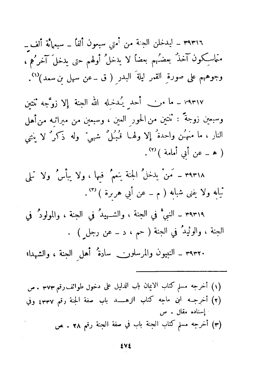 39317- "ما من أحد يدخله الله الجنة إلا زوجه ثنتين وسبعين زوجة: ثنتين من الحور العين، وسبعين من ميراثه من أهل النار، ما منهن واحدة إلا ولها قبل شهي وله ذكر لا ينثني". هـ - عن أبي أمامة" 2