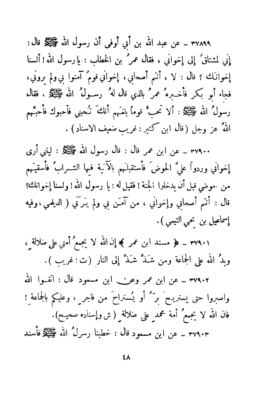 37901- "مسند ابن عمر "إن الله لا يجمع أمتي على ضلالة، ويد الله على الجماعة ومن شذ شذ إلى النار." ت: غريب".