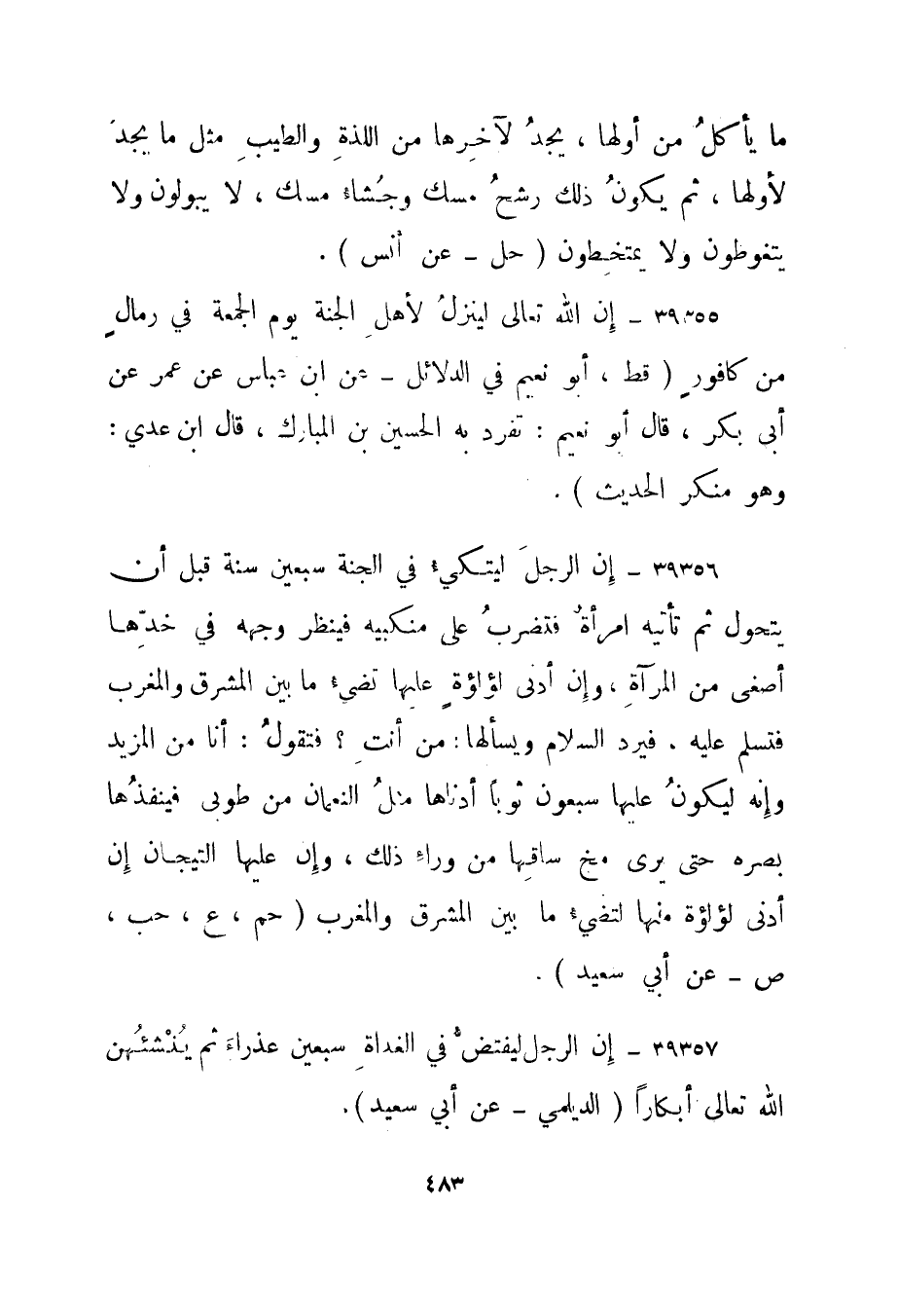 39355- "إن الله تعالى لينزل لأهل الجنة يوم الجمعة في رمال من كافور." قط، أبو نعيم في الدلائل - عن ابن عباس عن عمر عن أبي بكر، قال أبو نعيم: تفرد به الحسين بن المبارك، قال ابن عدي: وهو منكر الحديث".