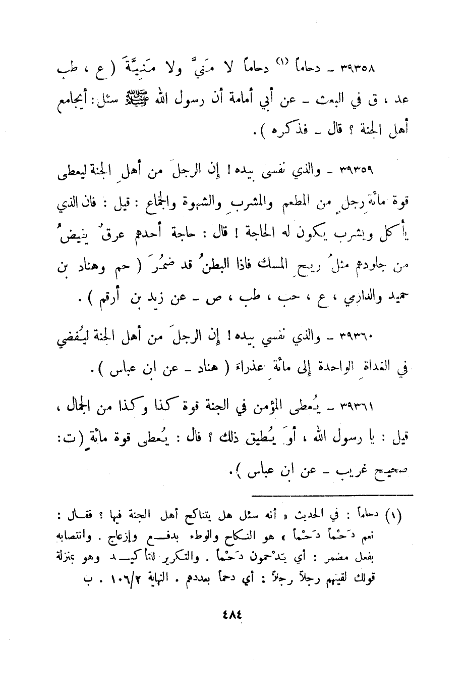 39361- "يعطى المؤمن في الجنة قوة كذا وكذا من الجمال، قيل: يا رسول الله، أو يطيق ذلك؟ قال: يعطى قوة مائة." ت: صحيح غريب - عن ابن عباس".