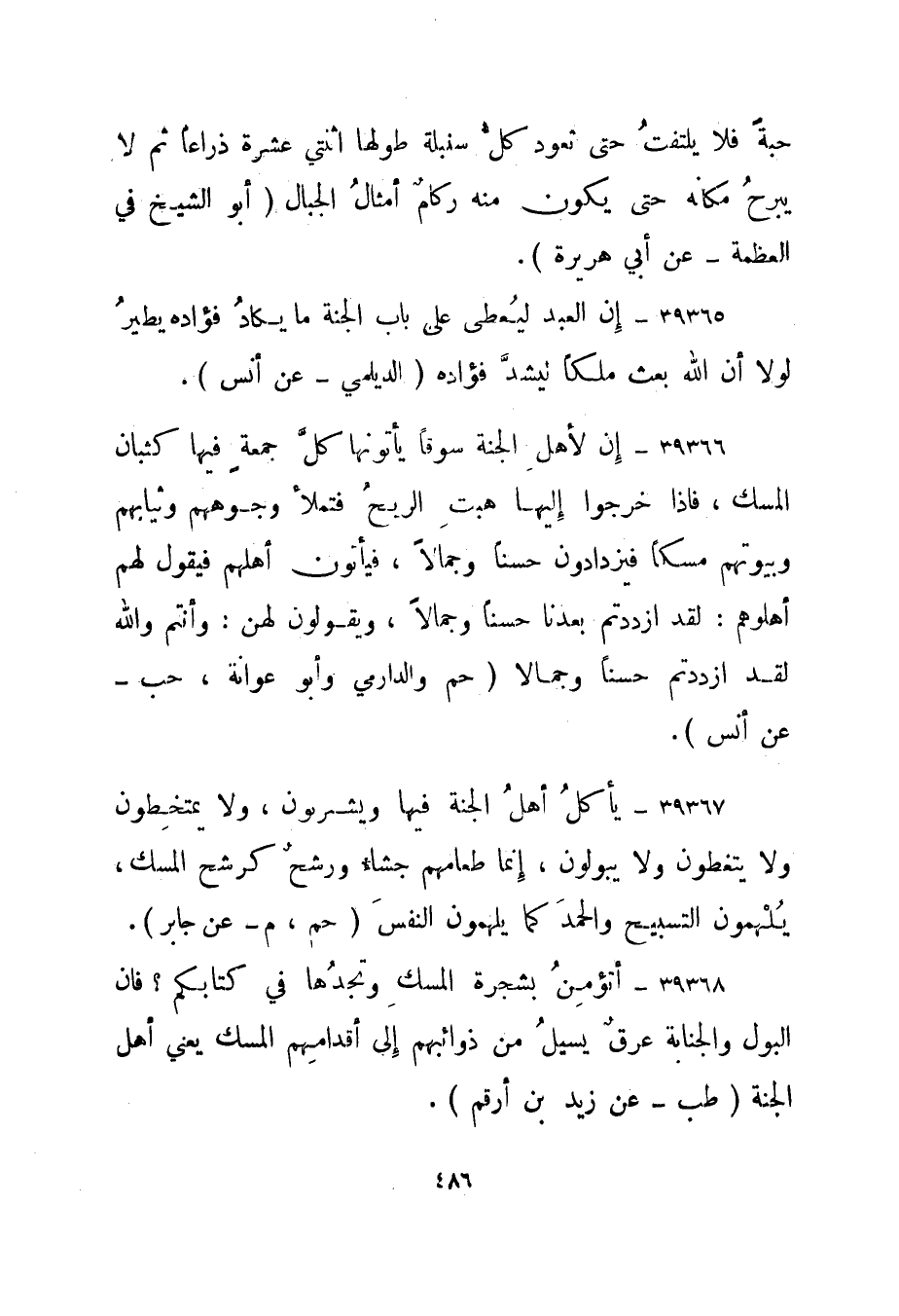 39367- "يأكل أهل الجنة فيها ويشربون، ولا يمتخطون ولا يتغوطون ولا يبولون، إنما طعامهم جشاء ورشح كرشح المسك، يلهمون التسبيح والحمد كما يلهمون النفس." حم، م - عن جابر".