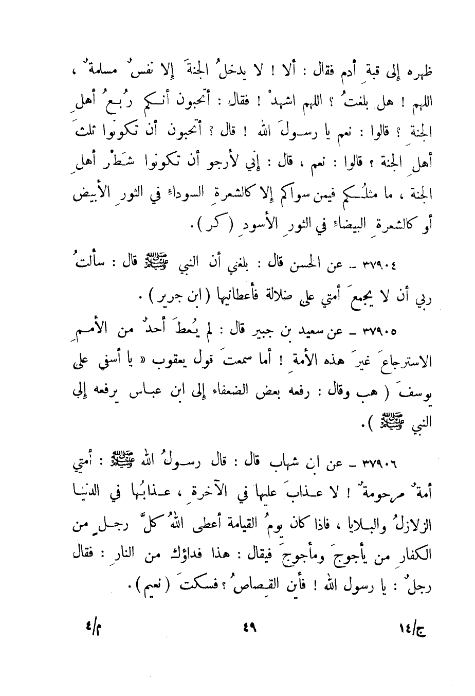 37904- عن الحسن قال: بلغني أن النبي صلى الله عليه وسلم قال: "سألت ربي أن لا يجمع أمتي على ضلالة فأعطانيها". "ابن جرير".
