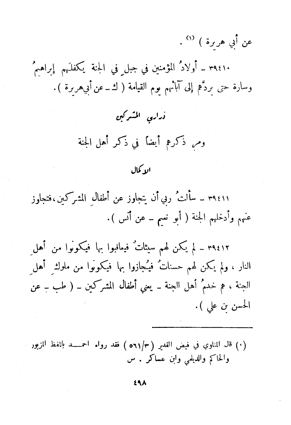 39410- "أولاد المؤمنين في جبل في الجنة يكفلهم إبراهيم وسارة حتى يردهم إلى آبائهم يوم القيامة." ك - عن أبي هريرة".