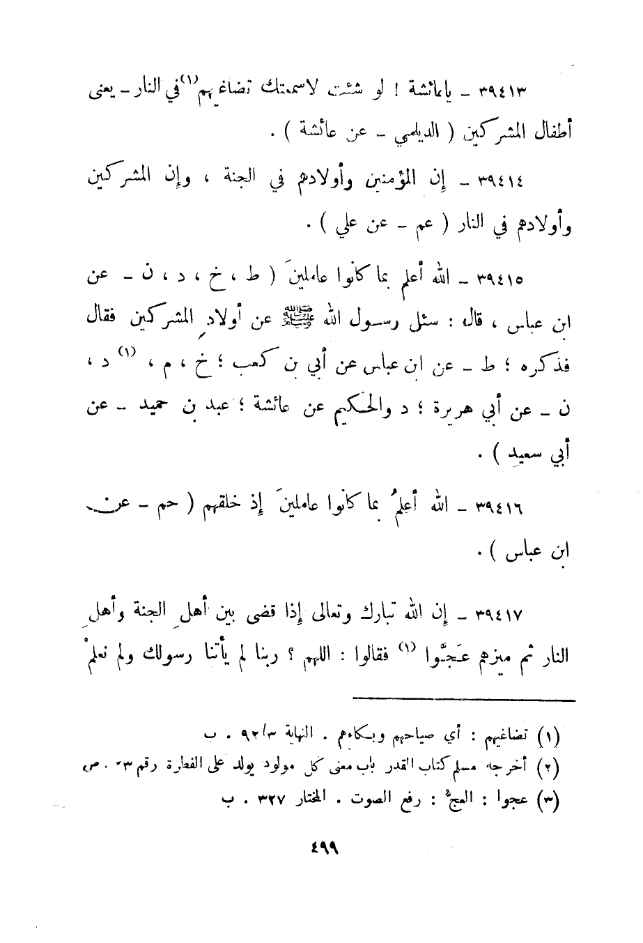 39415- "الله أعلم بما كانوا عاملين." ط، خ، د، ن - عن ابن عباس، قال: سئل رسول الله صلى الله عليه وسلم عن أولاد المشركين فقال فذكره؛ ط - عن ابن عباس عن أبي بن كعب؛ خ، م،2 د، ن - عن أبي هريرة؛ د والحكيم عن عائشة؛ عبد بن حميد - عن أبي سعيد".