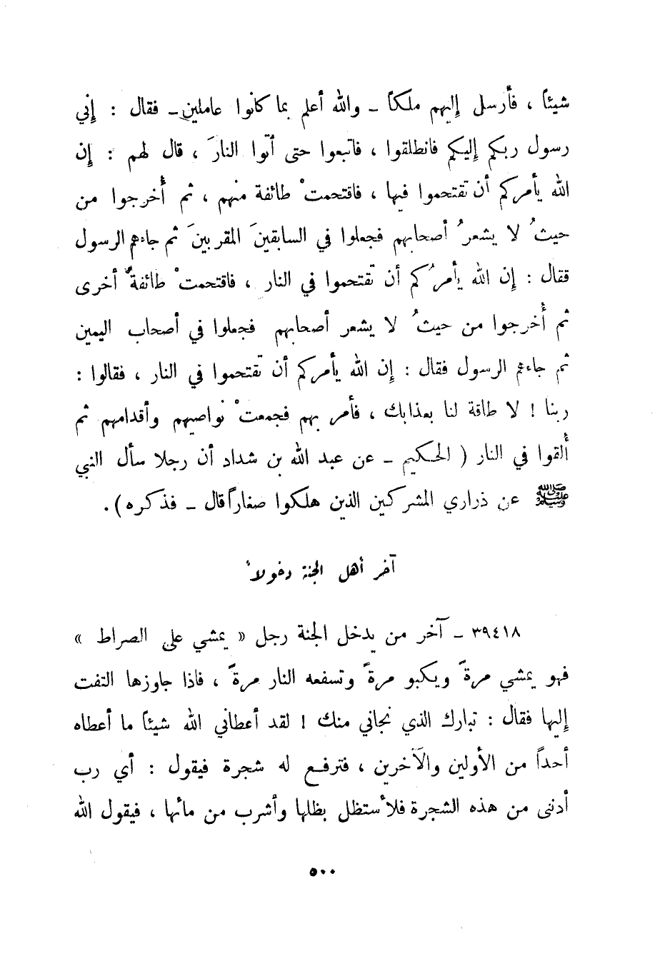 39418- "آخر من يدخل الجنة رجل "يمشي على الصراط" فهو يمشي مرة ويكبو مرة وتسفعه النار مرة، فإذا جاوزها التفت إليها فقال: تبارك الذي نجاني منك! لقد أعطاني الله شيئا ما أعطاه أحدا من الأولين والآخرين، فترفع له شجرة فيقول: أي رب أدننى من هذه الشجرة فلأستظل بظلها وأشرب من مائها، فيقول الله