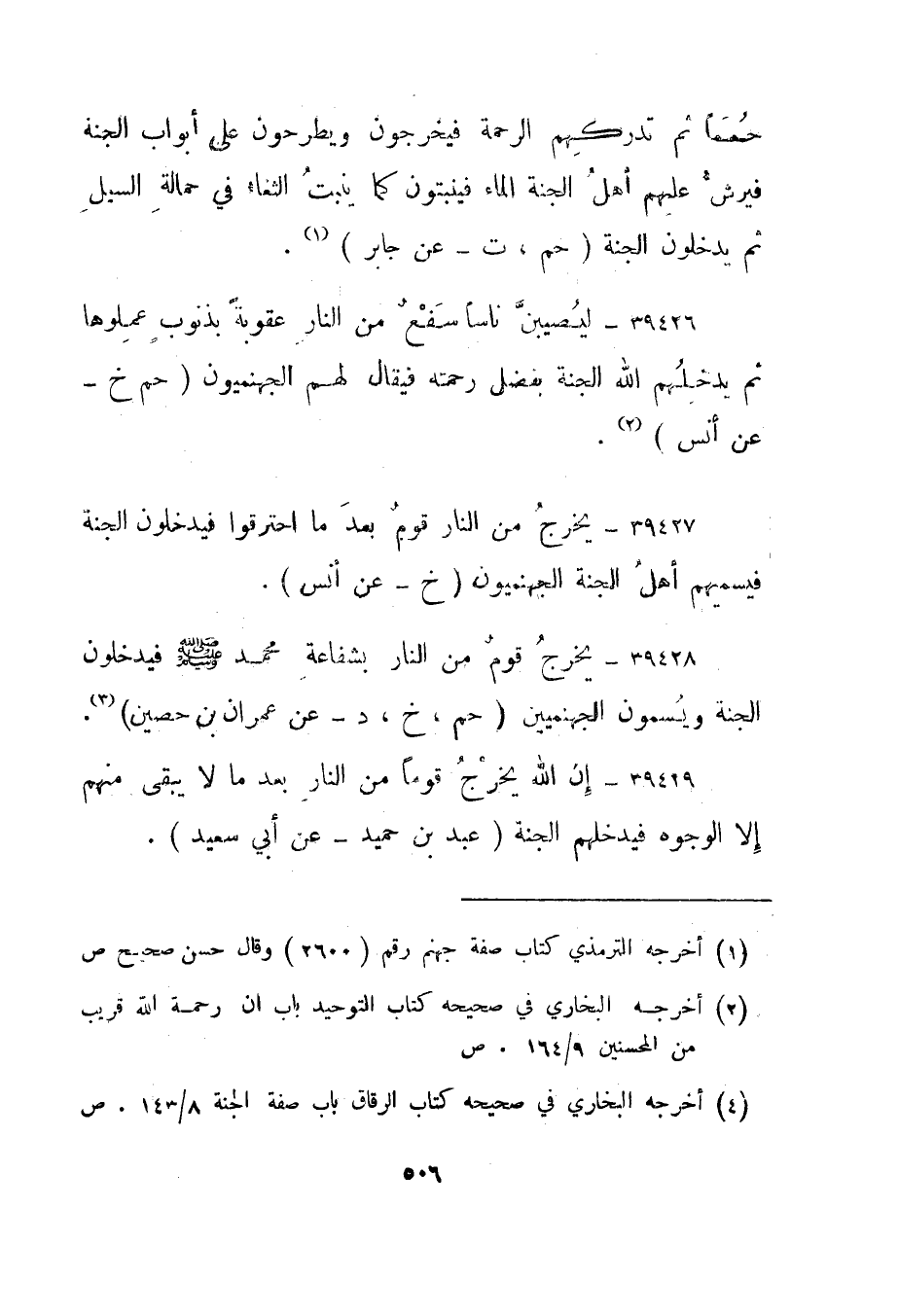 39428- "يخرج قوم من النار بشفاعة محمد صلى الله عليه وسلم فيدخلون الجنة ويسمون الجهنميين." حم، خ، د - عن عمران بن حصين"3