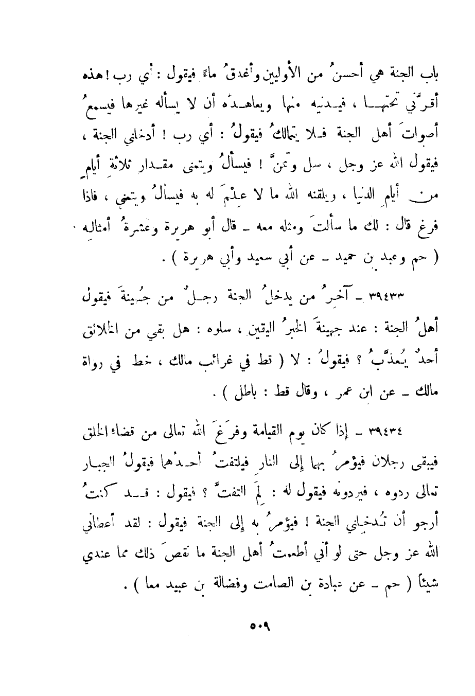 باب الجنة هي أحسن من الأوليين وأغدق ماء فيقول: أي رب! هذه أقرني تحتها، فيدنيه منها ويعاهده أن لا يسأله غيرها فيسمع أصوات أهل الجنة فلا يتمالك فيقول: أي رب! أدخلني الجنة، فيقول الله عز وجل، سل وتمن! فيسأل ويتمنى مقدار ثلاثة أيام من أيام الدنيا، ويلقنه الله ما لا علم له به فيسأل ويتمنى، فإذا فرغ قال: لك ما سألت ومثله معه - قال أبو هريرة وعشرة أمثاله." حم وعبد بن حميد - عن أبي سعيد وأبي هريرة".