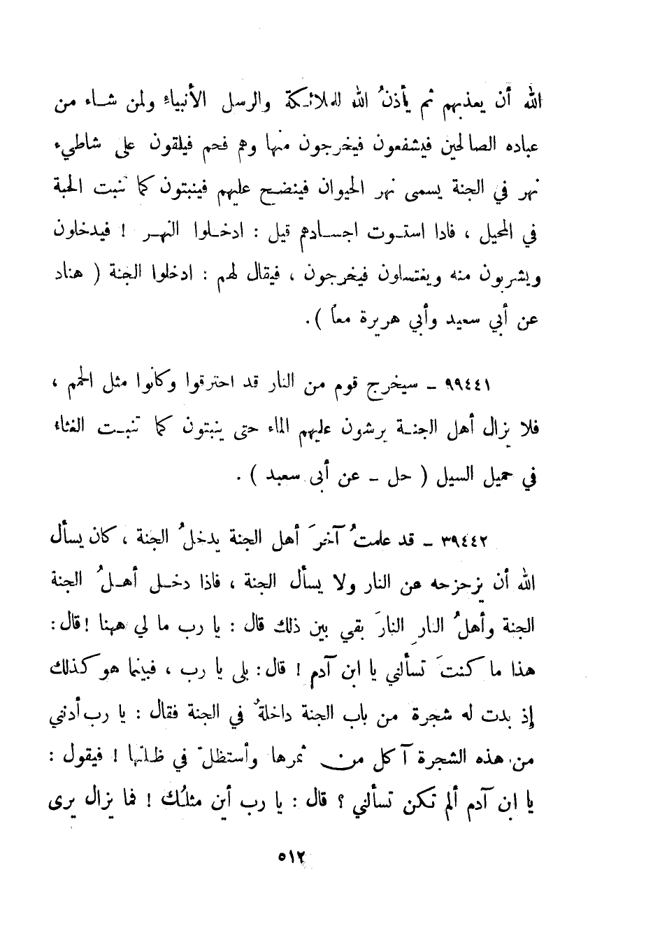 39442- "قد علمت آخر أهل الجنة يدخل الجنة، كان يسأل الله أن يزحزحه عن النار ولا يسأل الجنة، فإذا دخل أهل الجنة الجنة وأهل النار النار بقي بين ذلك قال: يا رب ما لي ههنا! قال: هذا ما كنت تسألني يا ابن آدم! قال: بلى يا رب، فبينما هو كذلك إذ بدت له شجرة من باب الجنة داخلة في الجنة فقال: يا رب أدنني من هذه الشجرة آكل من ثمرها وأستظل في ظلها! فيقول: يا ابن آدم ألم تكن تسألني؟ قال: يا رب أين مثلك! فما يزال يرى