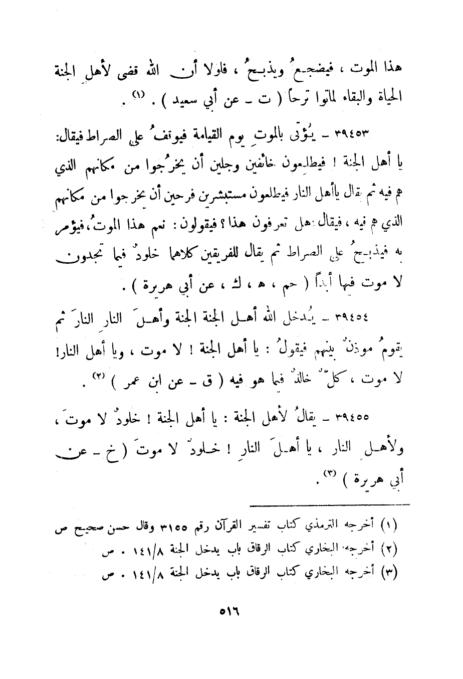 39455- "يقال لأهل الجنة: يا أهل الجنة! خلود لا موت، ولأهل النار، يا أهل النار! خلود لا موت." خ - عن أبي هريرة"3