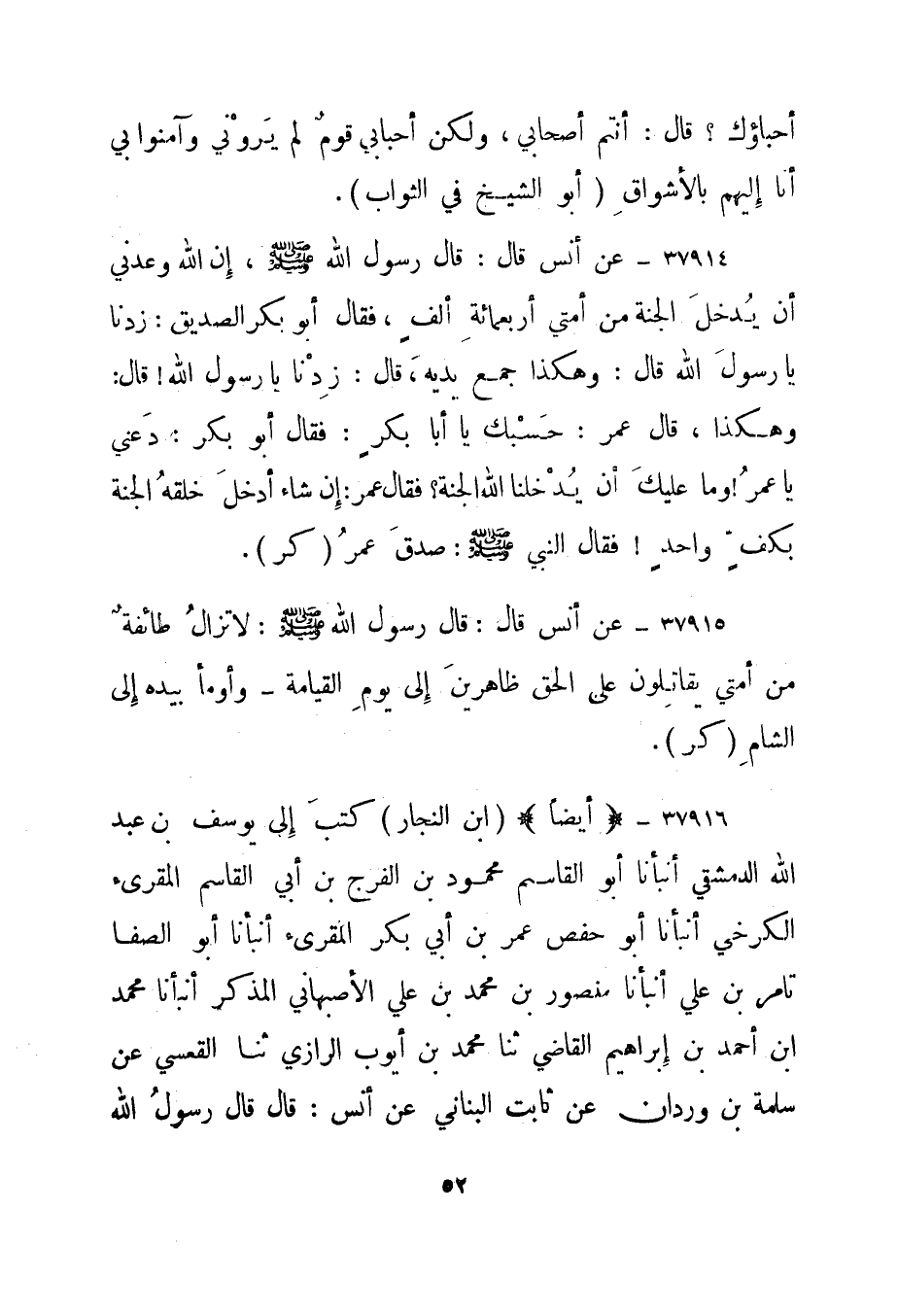 37914- عن أنس قال: قال رسول الله صلى الله عليه وسلم، "إن الله وعدني أن يدخل الجنة من أمتي أربعمائة ألف"، فقال أبو بكر الصديق: زدنا يا رسول الله قال: وهكذا جمع يديه، قال: زدنا يا رسول الله! قال: وهكذا، قال عمر: حسبك يا أبا بكر: فقال أبو بكر: دعني يا عمر! وما عليك أن يدخلنا الله الجنة؟ فقال عمر: إن شاء أدخل خلقه الجنة بكف واحد! فقال النبي صلى الله عليه وسلم: "صدق عمر". "كر".