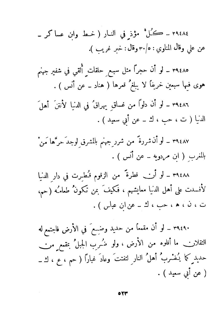 39485- "لو أن حجرا مثل سبع حلقات ألقي في شفير جهنم هوى فيها سبعين خريفا لا يبلغ قعرها." هناد - عن أنس".