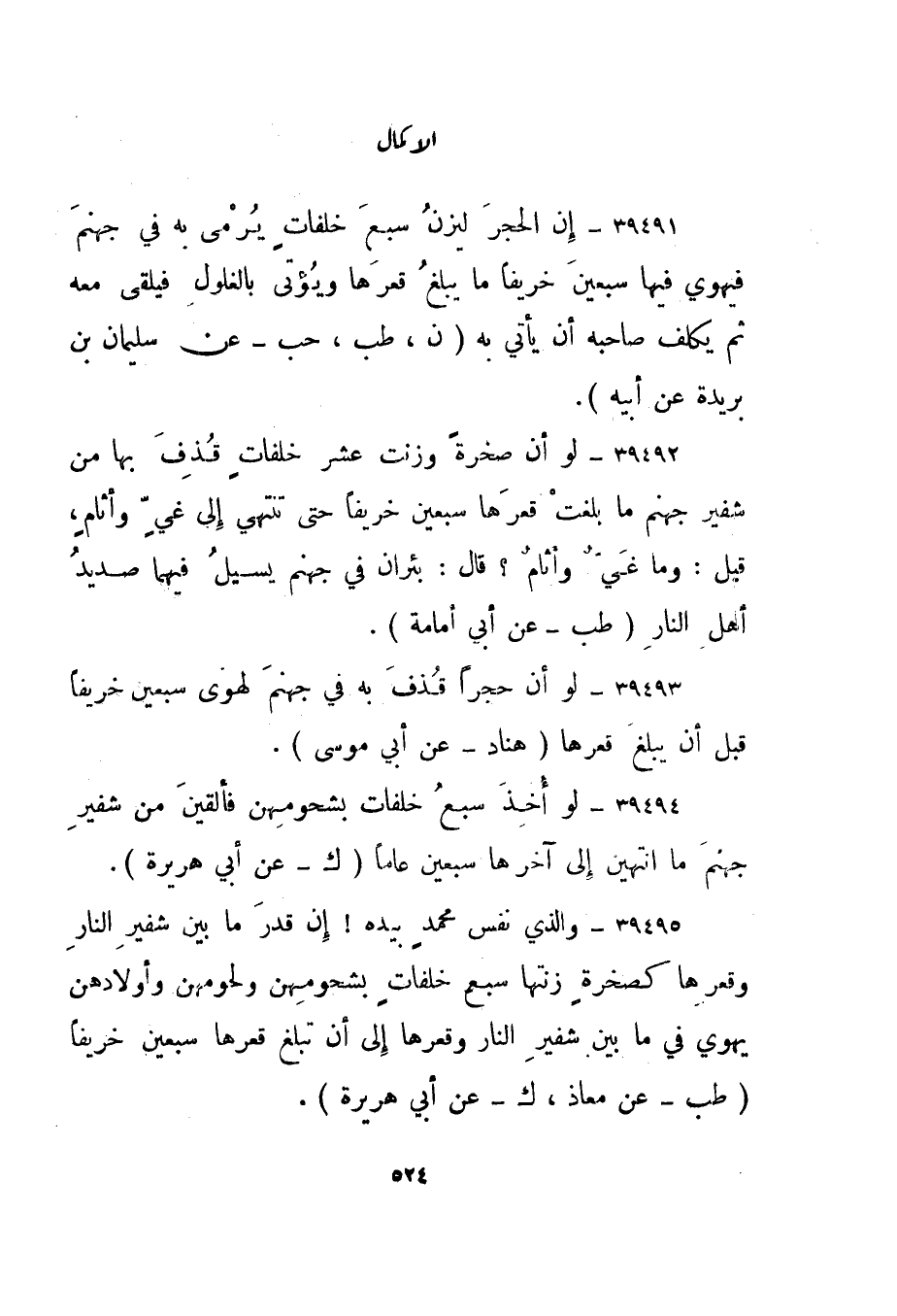 39493- "لو أن حجرا قذف به في جهنم لهوى سبعين خريفا قبل أن يبلغ قعرها." هناد - عن أبي موسى".