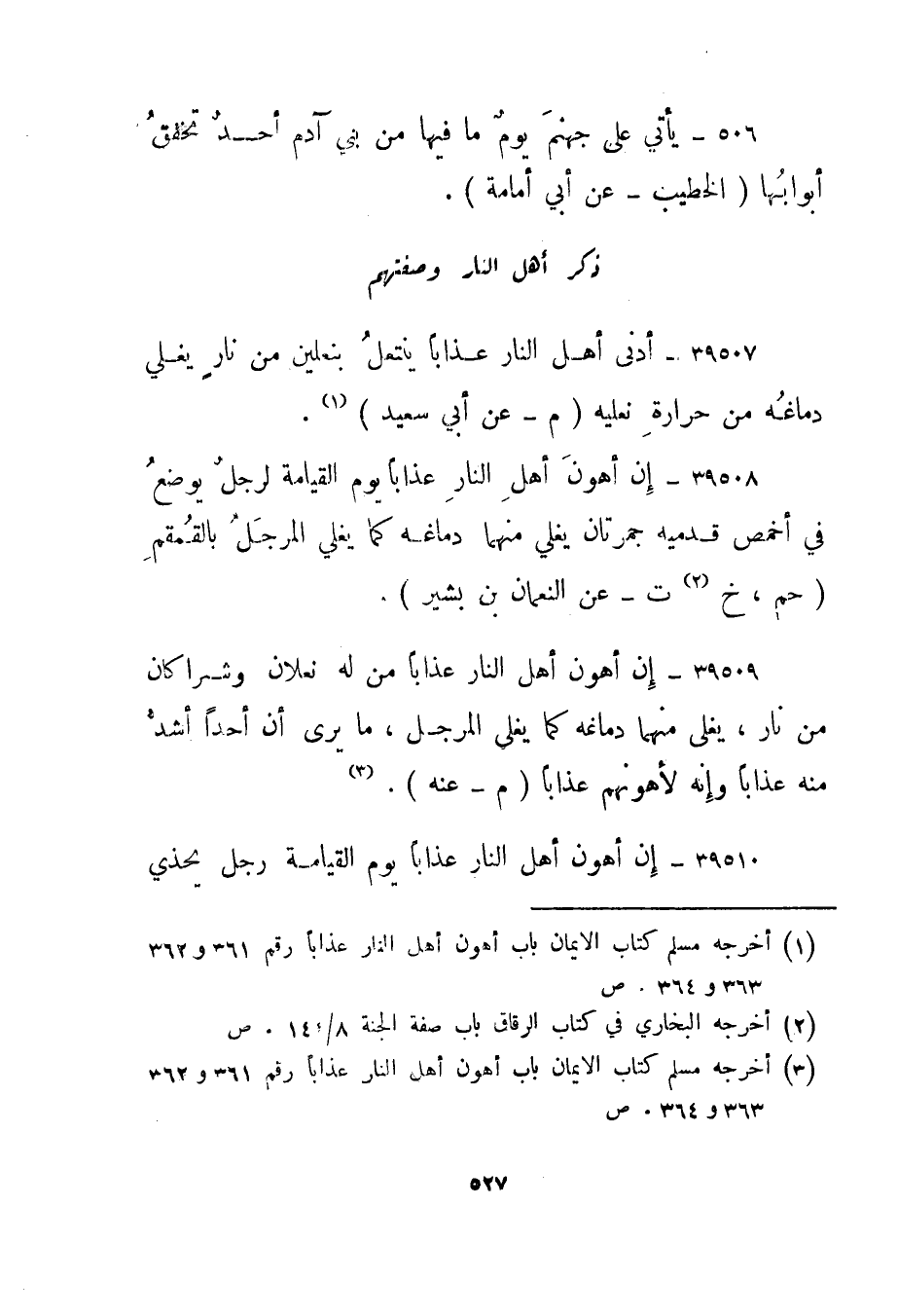 39508- "إن أهون أهل النار عذابا يوم القيامة لرجل يوضع في أخمص قدميه جمرتان يغلي منهما دماغه كما يغلي المرجل بالقمقم." حم، خ2 ت - عن النعمان بن بشير".