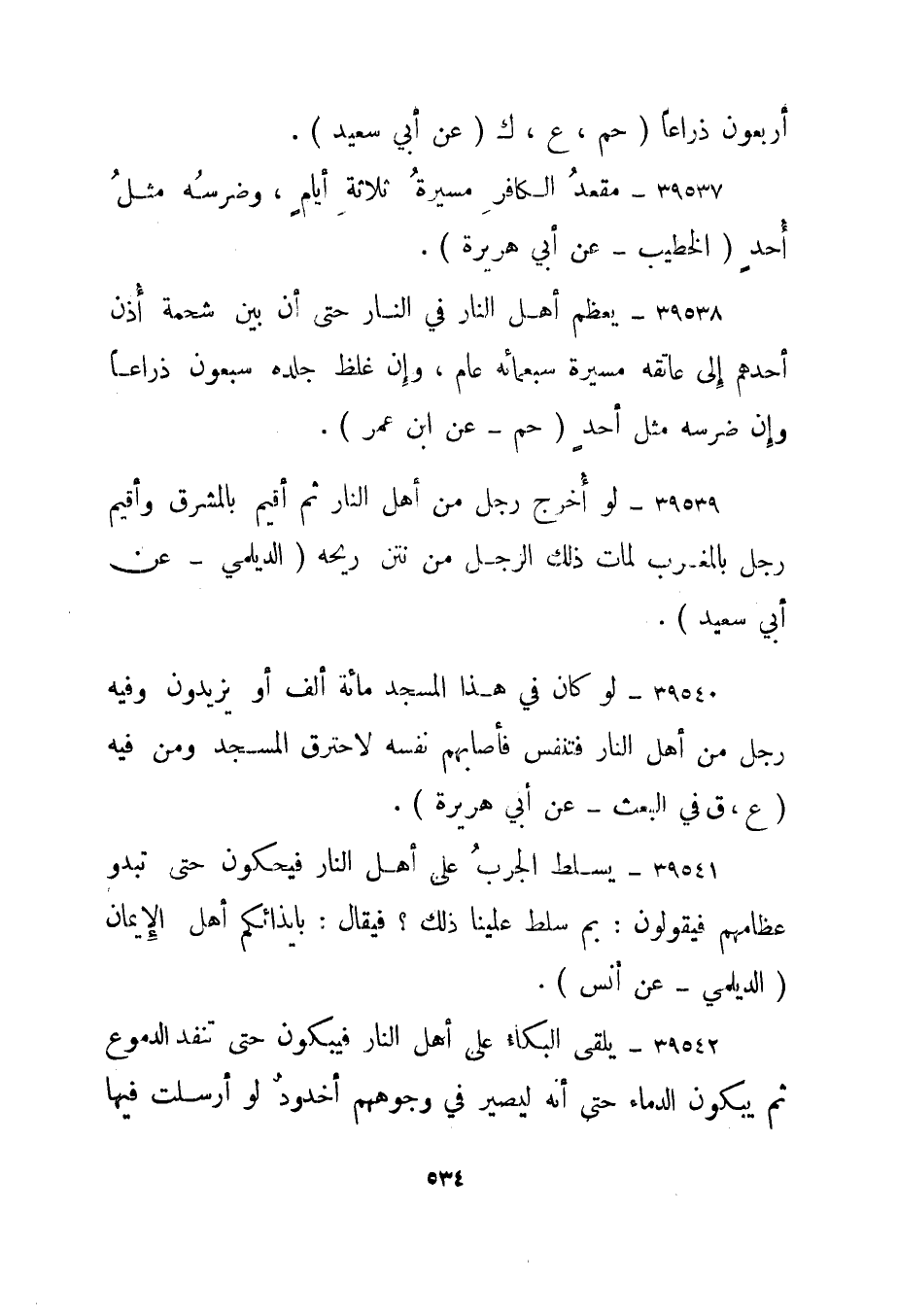 39542- "يلقى البكاء على أهل النار فيبكون حتى تنفد الدموع ثم يبكون الدماء حتى أنه ليصير في وجوههم أخدود لو أرسلت فيها