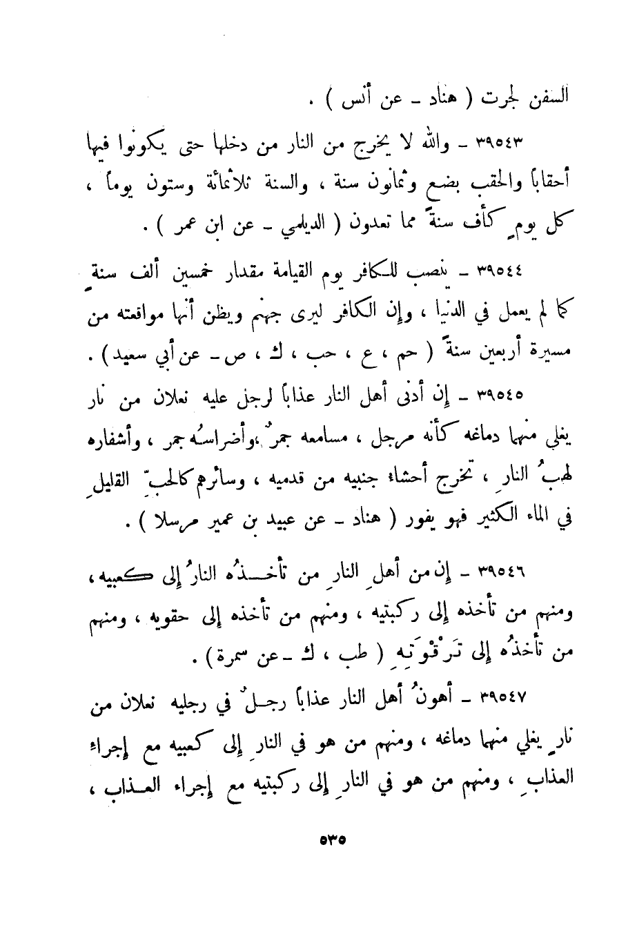 39545- "إن أدنى أهل النار عذابا لرجل عليه نعلان من نار يغلى منهما دماغه كأنه مرجل، مسامعه جمر، وأضراسه جمر، وأشفاره لهب النار، تخرج أحشاء جنبيه من قدميه، وسائرهم كالحب القليل في الماء الكثير فهو يفور." هناد - عن عبيد بن عمير مرسلا".