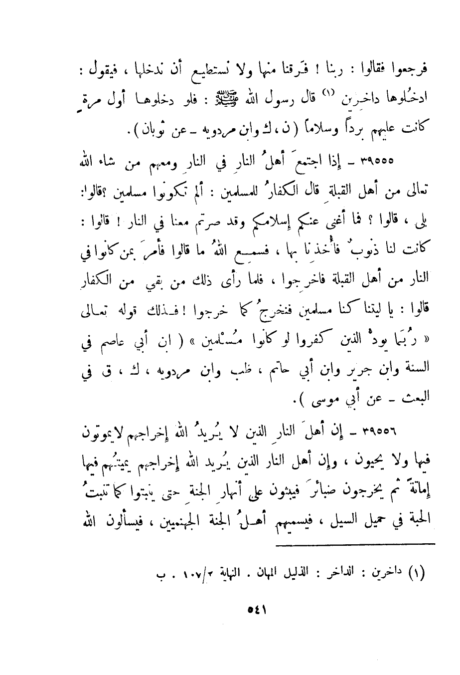 39555- "إذا اجتمع أهل النار في النار ومعهم من شاء الله تعالى من أهل القبلة قال الكفار للمسلمين: ألم تكونوا مسلمين؟ قالوا: بلى، قالوا: فما أغنى عنكم إسلامكم وقد صرتم معنا في النار! قالوا: كانت لنا ذنوب فأخذنا بها، فسمع الله ما قالوا فأمر بمن كانوا في النار من أهل القبلة فاخرجوا، فلما رأى ذلك من بقي من الكفار قالوا: يا ليتنا كنا مسلمين فنخرج كما خرجوا! فذلك قوله تعالى {رُبَمَا يَوَدُّ الَّذِينَ كَفَرُوا لَوْ كَانُوا مُسْلِمِينَ} . "ابن أبي عاصم في السنة وابن جرير وابن أبي حاتم، طب وابن مردويه، ك، ق في البعث - عن أبي موسى".