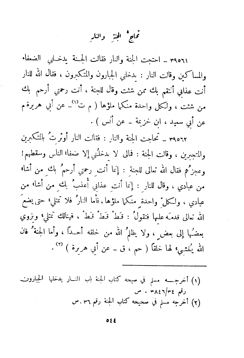 39561- "احتجت الجنة والنار فقالت الجنة يدخلني الضعفاء والمساكين وقالت النار: يدخلني الجبارون والمتكبرون، فقال الله للنار أنت عذابي أنتقم بك ممن شئت وقال للجنة، أنت رحمتي أرحم بك من شئت، ولكل واحدة منكما ملؤها." م ت 1- عن أبي هريرة م عن أبي سعيد، ابن خزيمة - عن أنس".