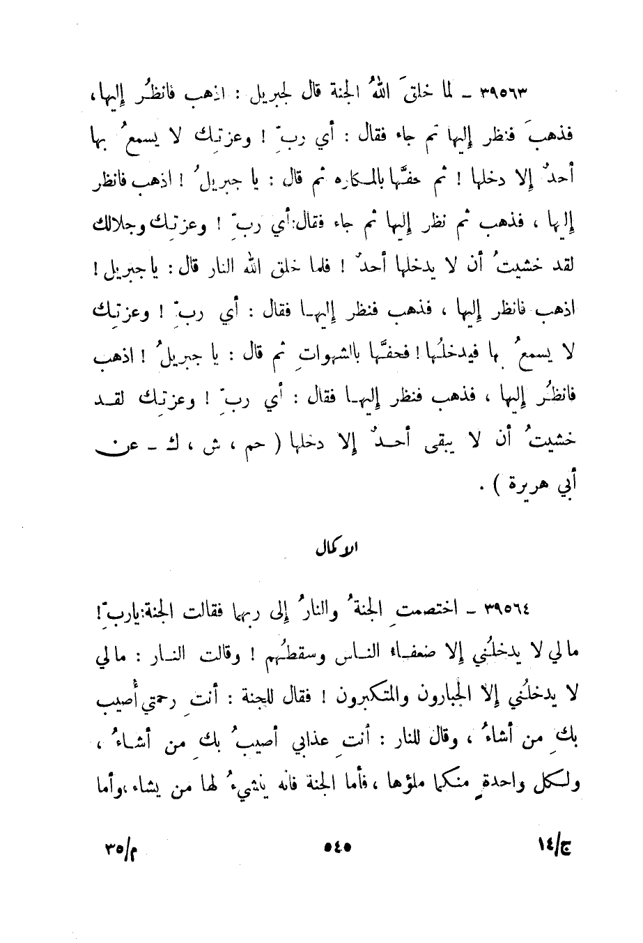 39564- "اختصمت الجنة والنار إلى ربهما فقالت الجنة: يا رب! ما لي لا يدخلني إلا ضعفاء الناس وسقطهم! وقالت النار: ما لي لا يدخلني إلا الجبارون والمتكبرون! فقال للجنة: أنت رحمتي أصيب بك من أشاء، وقال للنار: أنت عذابي أصيب بك من أشاء، ولكل واحدة منكما ملؤها، فأما الجنة فإنه ينشيء لها من يشاء، وأما