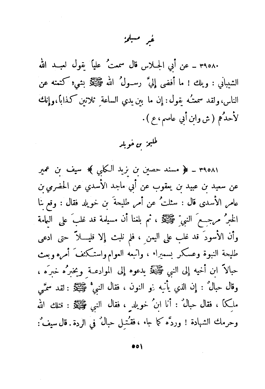 39581- "مسند حصين بن يزيد الكلبي" سيف بن عمير عن سعيد بن عبيد بن يعقوب عن أبي ماجد الأسدي عن الحضرمي بن عامر الأسدي قال: سئلت عن أمر طليحة بن خويلد فقال: وقع بنا الخبر مرجع النبي صلى الله عليه وسلم، ثم بلغنا أن مسيلمة قد غلب على اليمامة وأن الأسود قد غلب على اليمن، فلم نلبث إلا قليلا حتى ادعى طليحة النبوة وعسكر بسميراء، واتبعه العوام واستكثف أمره وبعث حبالا ابن أخيه إلى النبي صلى الله عليه وسلم يدعوه إلى الموادعة ويخبره خبره، وقال حبال: إن الذي يأتيه ذو النون، فقال النبي صلى الله عليه وسلم: لقد سمي ملكا، فقال حبال: أنا ابن خويلد، فقال النبي صلى الله عليه وسلم: "قتلك الله وحرمك الشهادة! " ورده كما جاء، فقتل حبال في الردة. قال سيف: