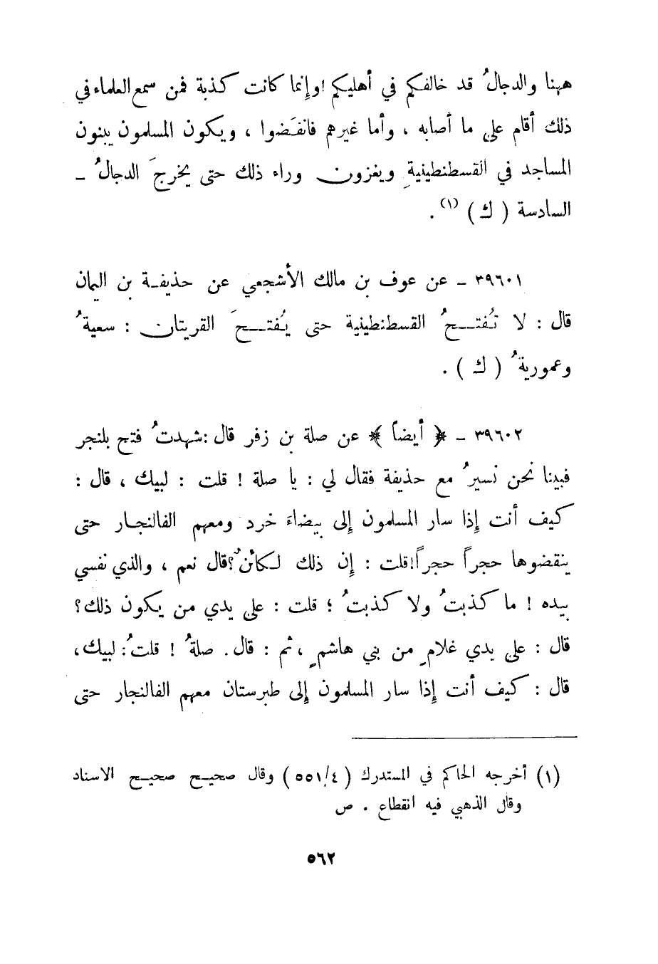 39601- عن عوف بن مالك الأشجعي عن حذيفة بن اليمان قال: لا تفتح القسطنطينية حتى يفتح القريتان: سعية وعمورية."ك".