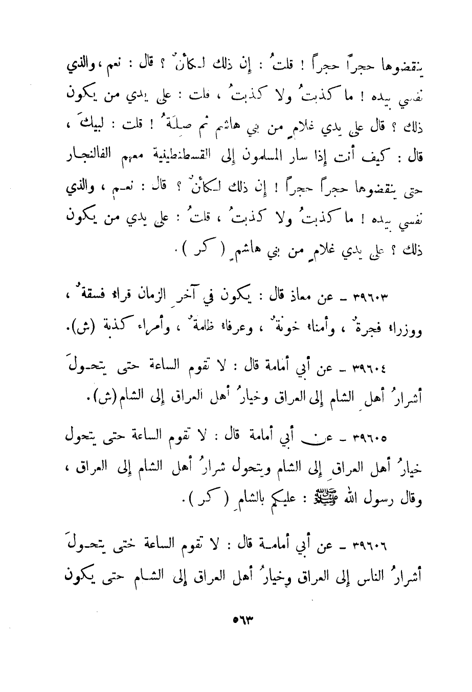 39605- عن أبي أمامة قال: "لا تقوم الساعة حتى يتحول خيار أهل العراق إلى الشام ويتحول شرار أهل الشام إلى العراق، وقال رسول الله صلى الله عليه وسلم: "عليكم بالشام." كر".