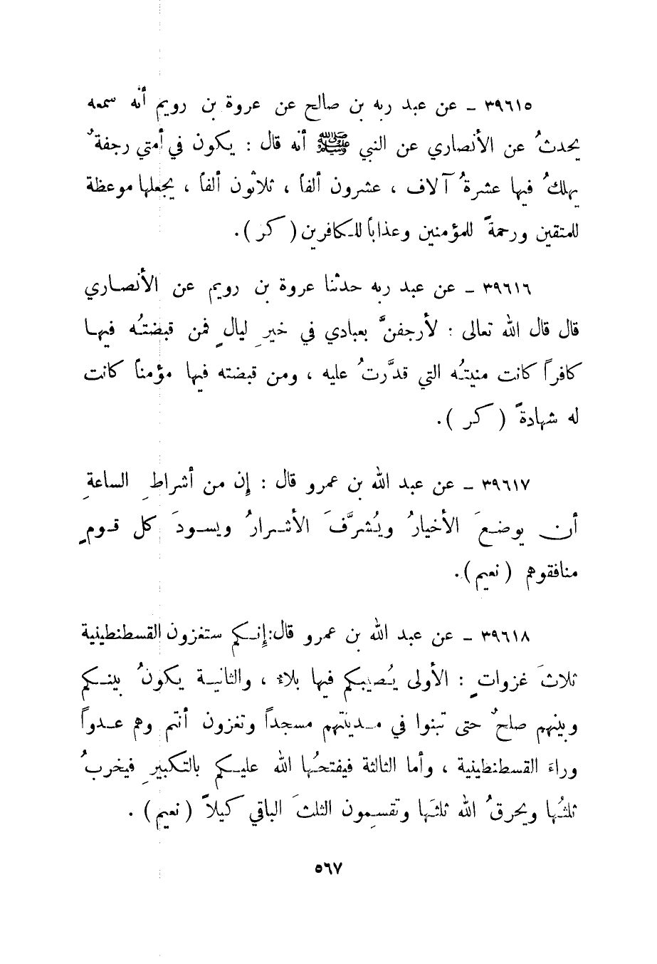 39618- عن عبد الله بن عمرو قال: " إنكم ستغزون القسطنطينية ثلاث غزوات: الأولى يصيبكم فيها بلاء، والثانية يكون بينكم وبينهم صلح حتى تبنوا في مدينتهم مسجدا وتغزون أنتم وهم عدوا وراء القسطنطينية، وأما الثالثة فيفتحها الله عليكم بالتكبير فيخرب ثلثها ويحرق الله ثلثها وتقسمون الثلث الباقي كيلا." نعيم".