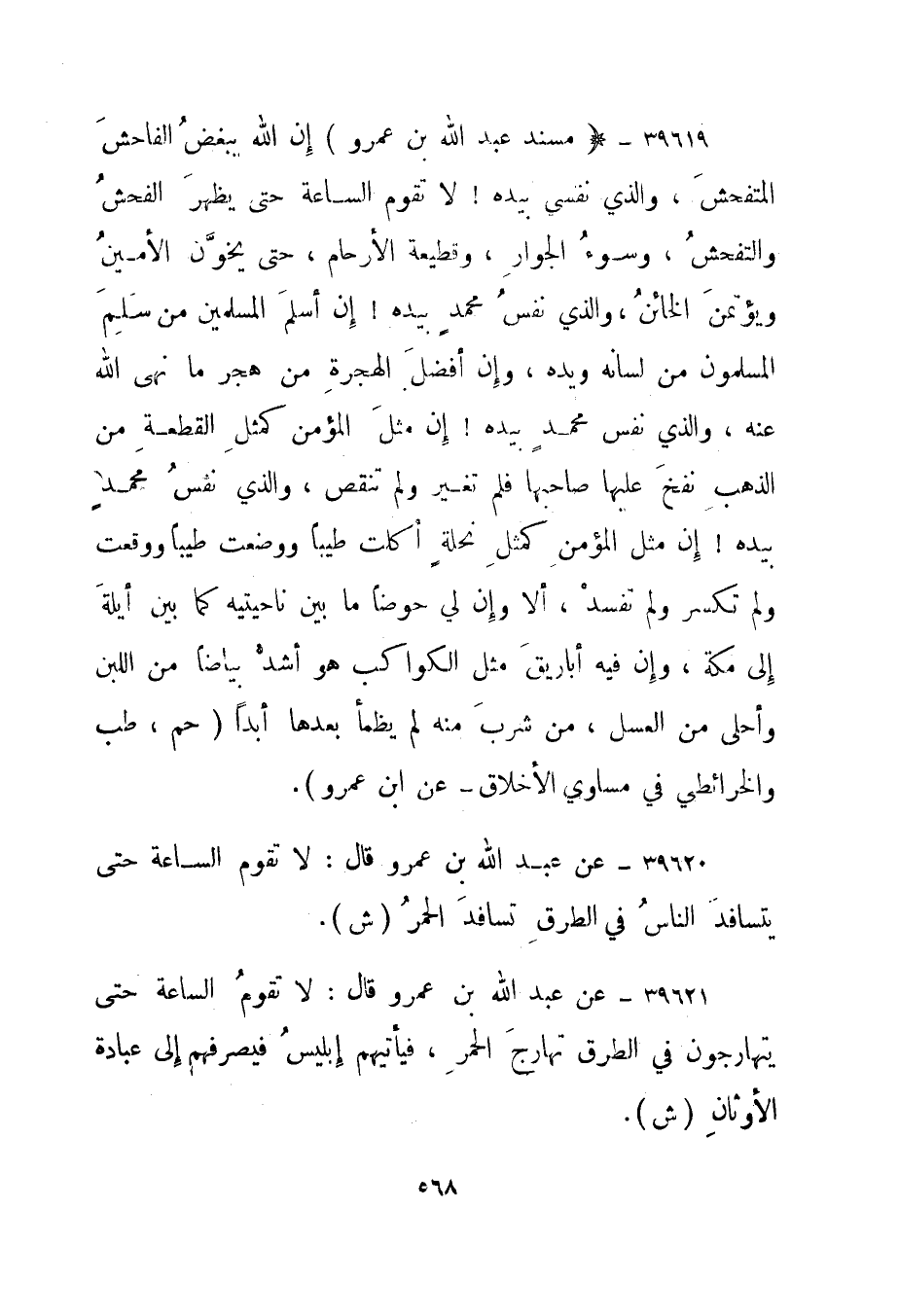 39620- عن عبد الله بن عمرو قال: "لا تقوم الساعة حتى يتسافد الناس في الطرق تسافد الحمر." ش".