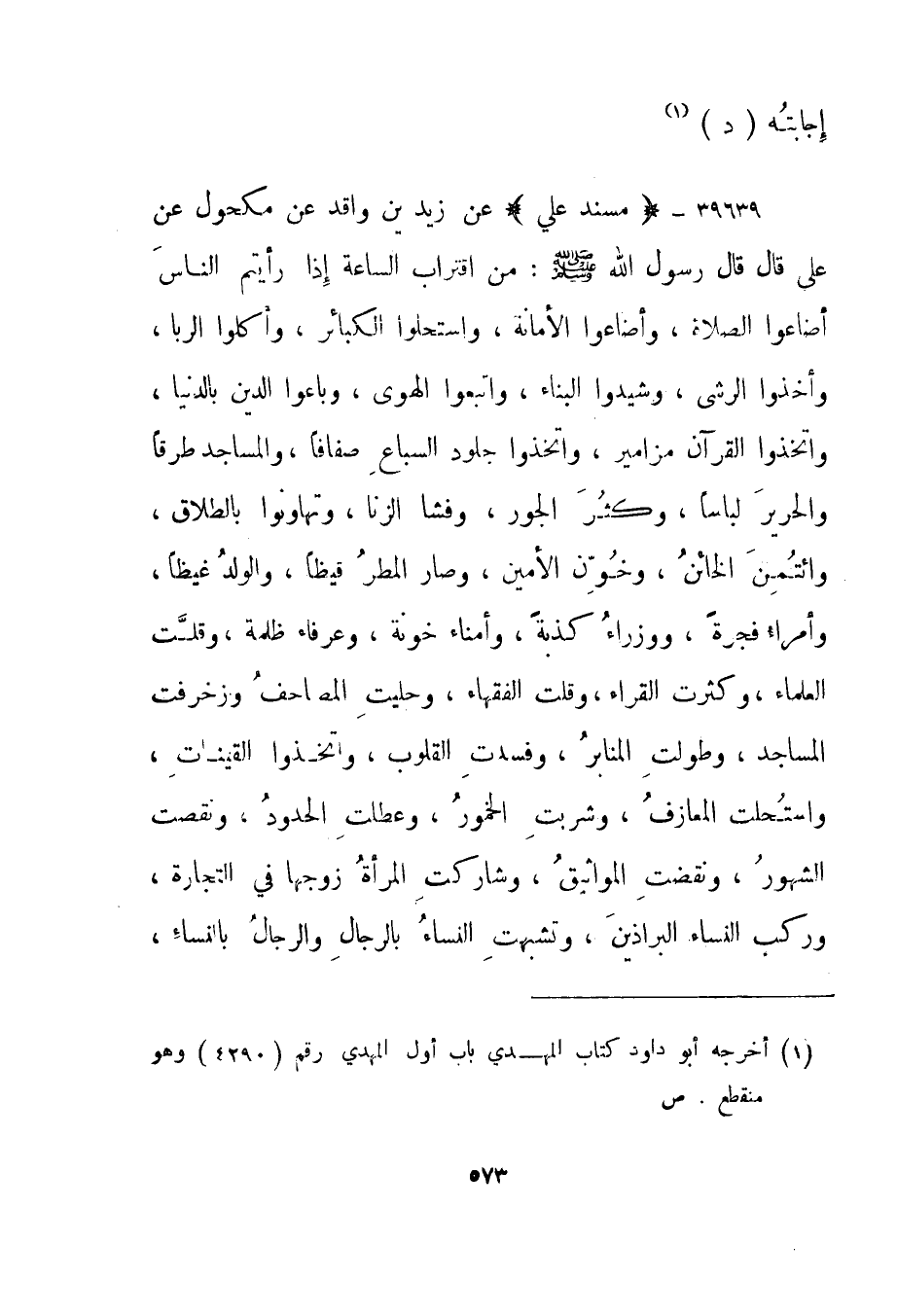 39639- "مسند علي" عن زيد بن واقد عن مكحول عن علي قال قال رسول الله صلى الله عليه وسلم: "من اقتراب الساعة إذا رأيتم الناس أضاعوا الصلاة، وأضاعوا الأمانة، واستحلوا الكبائر، وأكلوا الربا، وأخذوا الرشى، وشيدوا البناء، واتبعوا الهوى، وباعوا الدين بالدنيا، واتخذوا القرآن مزامير، واتخذوا جلود السباع صفافا، والمساجد طرقا والحرير لباسا، وكثر الجور، وفشا الزنا، وتهاونوا بالطلاق، وائتمن الخائن، وخون الأمين، وصار المطر قيظا، والولد غيظا، وأمراء فجرة، ووزراء كذبة، وأمناء خونة، وعرفاء ظلمة، وقلت العلماء، وكثرت القراء، وقلت الفقهاء، وحليت المصاحف وزخرفت المساجد، وطولت المنابر، وفسدت القلوب، واتخذوا القينات، واستحلت المعازف، وشربت الخمور، وعطلت الحدود، ونقصت الشهور، ونقضت المواثيق، وشاركت المرأة زوجها في التجارة، وركب النساء البراذين، وتشبهت النساء بالرجال والرجال بالنساء،