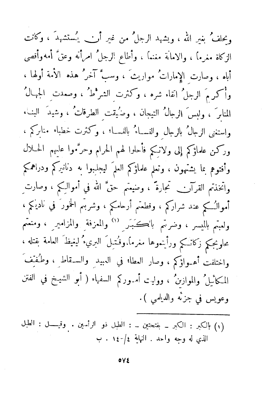 ويحلف بغير الله، ويشهد الرجل من غير أن يستشهد، وكانت الزكاة مغرما، والأمانة مغنما، وأطاع الرجل امرأته وعق أمه وأقصى أباه، وصارت الإمارات مواريث، وسب آخر هذه الأمة أولها، وأكرم الرجل اتقاء شره، وكثرت الشرط، وصعدت الجهال المنابر، ولبس الرجال التيجان، وضيقت الطرقات، وشيد البناء واستغنى الرجال بالرجال والنساء بالنساء، وكثرت خطباء منابركم، وركن علماؤكم إلى ولاتكم فأحلوا لهم الحرام وحرموا عليهم الحلال وأفتوهم بما يشتهون، وتعلم علماؤكم العلم ليجلبوا به دنانيركم ودراهمكم واتخذتم القرآن تجارة، وضيعتم حق الله في أموالكم، وصارت أموالكم عند شراركم، وقطعتم أرحامكم، وشربتم الخمور في ناديكم، ولعبتم بالميسر، وضربتم بالكبر1 والمعزفة والمزامير، ومنعتم محاويجكم زكاتكم ورأيتموها مغرما، وقتل البريء ليغيظ العامة بقتله، واختلفت أهواؤكم، وصار العطاء في العبيد والسقاط، وطفف المكائيل والموازين، ووليت أموركم السفهاء." أبو الشيخ في الفتن وعويس في جزئه والديلمي".