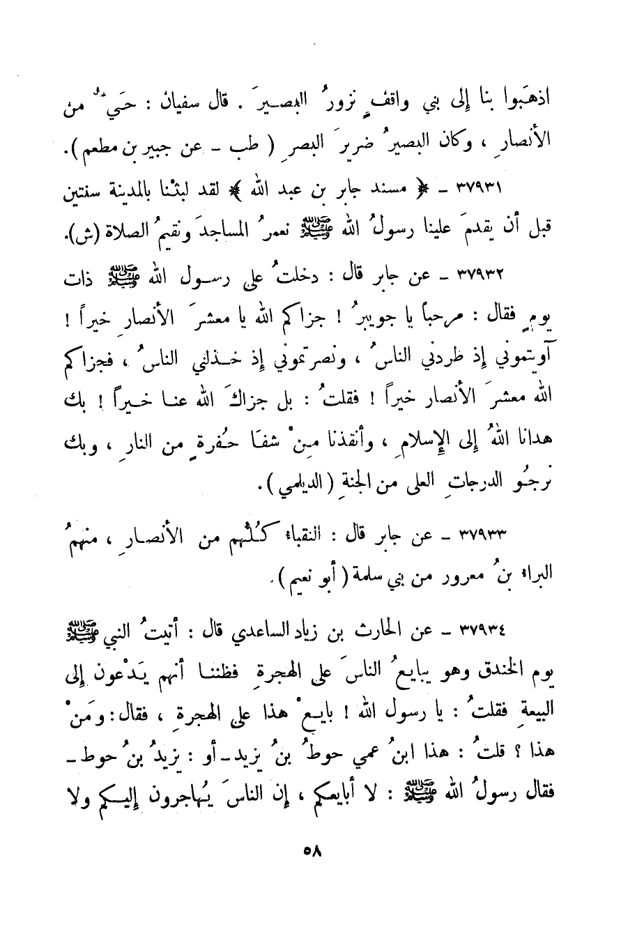 37934- عن الحارث بن زياد الساعدي قال: أتيت النبي صلى الله عليه وسلم يوم الخندق وهو يبايع الناس على الهجرة فظننا أنهم يدعون إلى البيعة فقلت: يا رسول الله! بايع هذا على الهجرة، فقال: "ومن هذا؟ " قلت: هذا ابن عمي حوط بن يزيد - أو: يزيد بن حوط - فقال رسول الله صلى الله عليه وسلم: "لا أبايعكم، إن الناس يهاجرون إليكم ولا