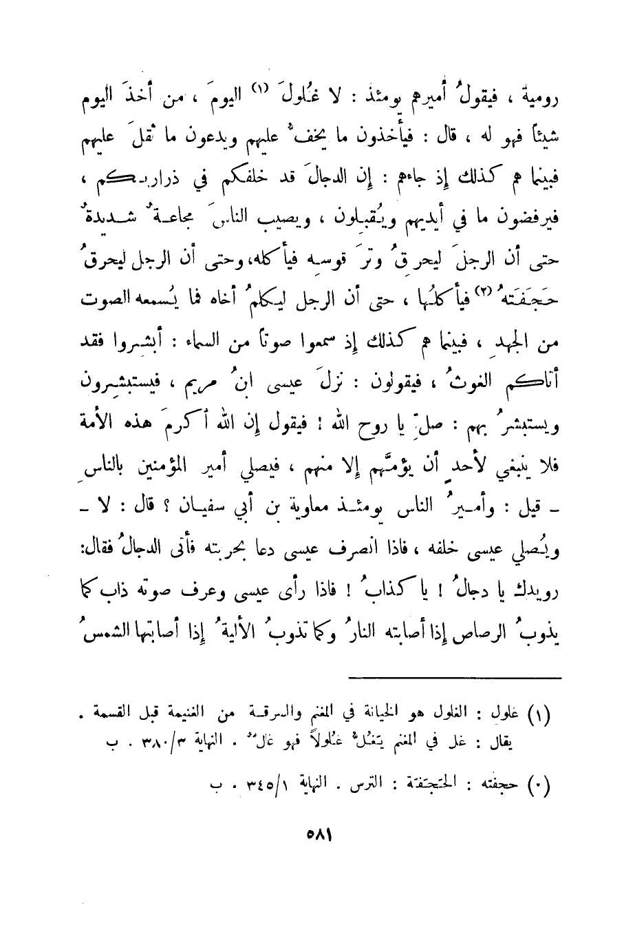رومية، فيقول أميرهم يومئذ: لا غلول1 اليوم، من أخذ اليوم شيئا فهو له، قال: فيأخذون ما يخف عليهم ويدعون ما ثقل عليهم فبينما هم كذلك إذ جاءهم: إن الدجال قد خلفكم في ذراريكم، فيرفضون ما في أيديهم ويقبلون، ويصيب الناس مجاعة شديدة حتى أن الرجل ليحرق وتر قوسه فيأكله، وحتى أن الرجل ليحرق حجفته2 فيأكلها، حتى أن الرجل ليكلم أخاه فما يسمعه الصوت من الجهد، فبينما هم كذلك إذ سمعوا صوتا من السماء: أبشروا فقد أتاكم الغوث، فيقولون: نزل عيسى ابن مريم، فيستبشرون ويستبشر بهم: صل يا روح الله! فيقول إن الله أكرم هذه الأمة فلا ينبغي لأحد أن يؤمهم إلا منهم، فيصلي أمير المؤمنين بالناس - قيل: وأمير الناس يومئذ معاوية بن أبي سفيان؟ قال: لا - ويصلي عيسى خلفه، فإذا انصرف عيسى دعا بحربته فأتى الدجال فقال: رويدك يا دجال! يا كذاب! فإذا رأى عيسى وعرف صوته ذاب كما يذوب الرصاص إذا أصابته النار وكما تذوب الألية إذا أصابتها الشمس