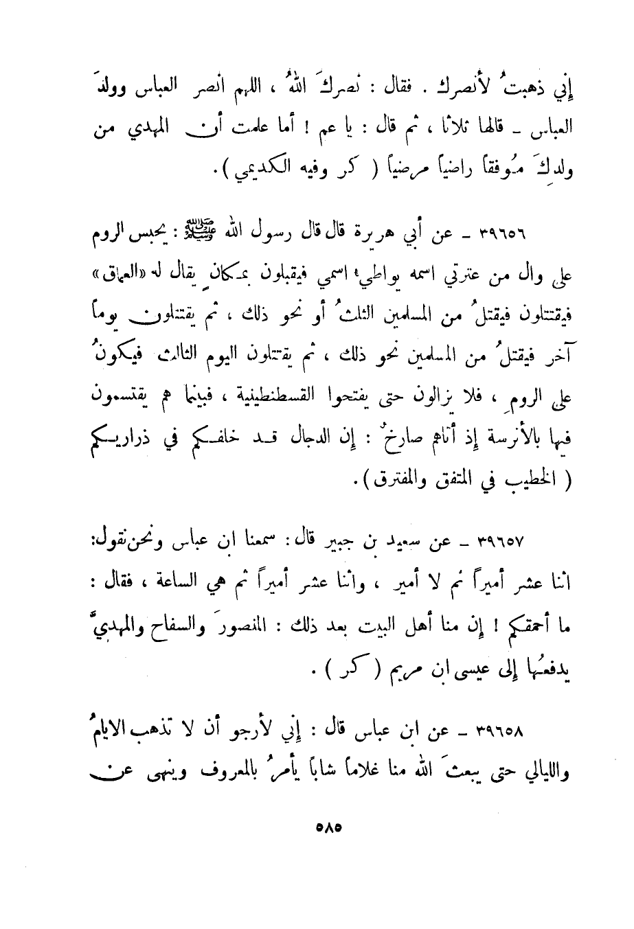 39657- عن سعيد بن جبير قال: سمعنا ابن عباس ونحن نقول: اثنا عشر أميرا ثم لا أمير، واثنا عشر أميرا ثم هي الساعة، فقال: ما أحمقكم! إن منا أهل البيت بعد ذلك: المنصور والسفاح والمهدي يدفعها إلى عيسى ابن مريم."كر".