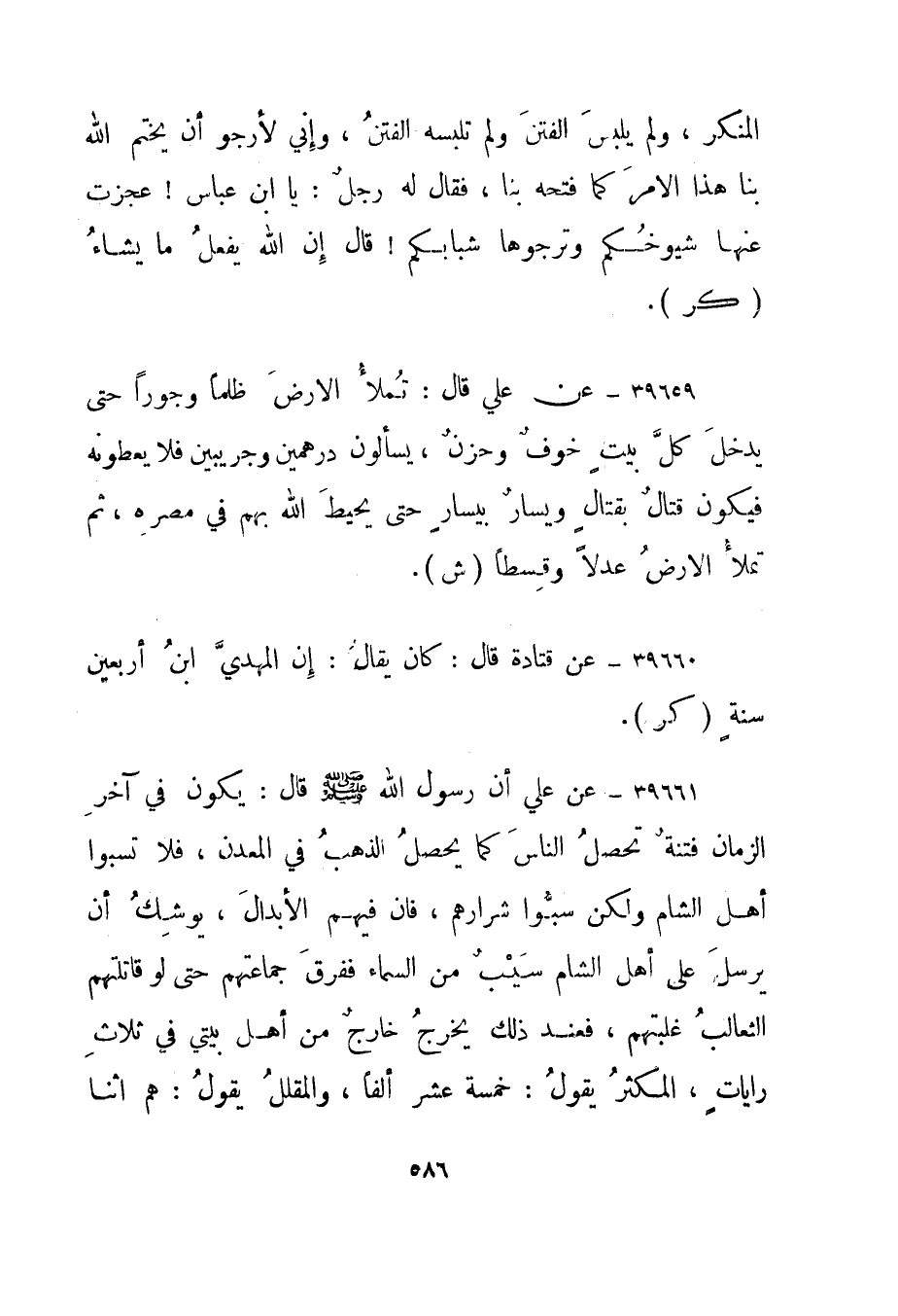 39659- عن علي قال: "تملأ الأرض ظلما وجورا حتى يدخل كل بيت خوف وحزن، يسألون درهمين وجريبين فلا يعطونه فيكون قتال بقتال ويسار بيسار حتى يحيط الله بهم في مصره، ثم تملأ الأرض عدلا وقسطا." ش".